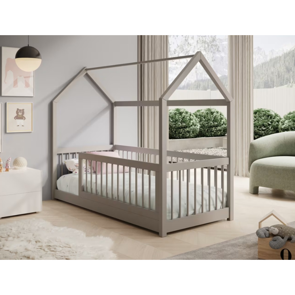 Detská posteľ domček GRAJA v sivej farbe s plochou na spanie 90 x 200 cm je ideálnou voľbou pre detskú izbu. Vďaka svojmu hravému dizajnu v tvare domčeka vytvára príjemné a bezpečné prostredie na spánok aj každodenné hry. Posteľ podporuje detskú fantáziu a zároveň ponúka stabilnú a pevnú konštrukciu s nosnosťou až 110 kg. Je vhodná pre malé deti ale aj staršie deti a skvele zapadne do moderných aj klasických interiérov. Súčasťou postele je rošt. Matrac je potrebné doobjednať.