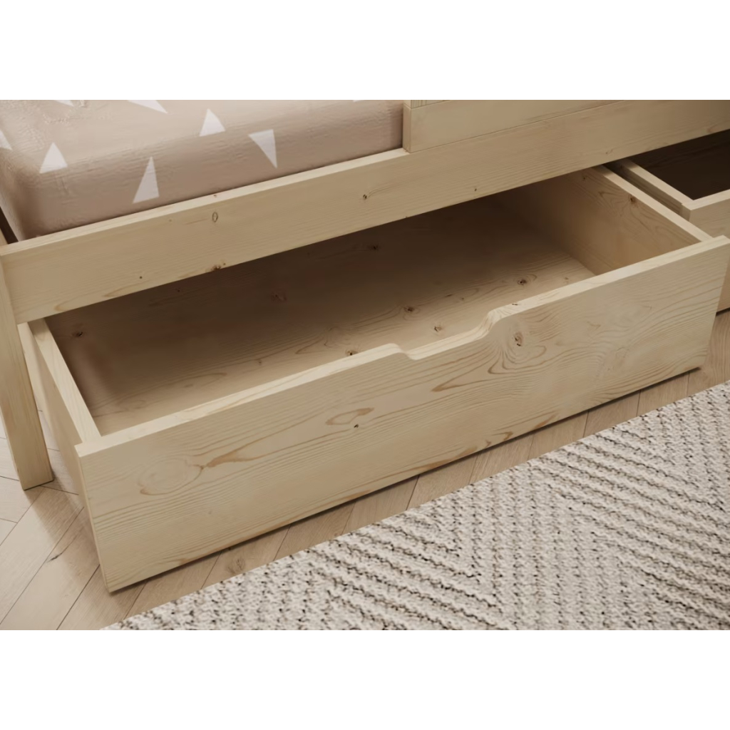 Detská posteľ GALICJA je vyrobená z masívneho dreva ponúka výnimočnú stabilitu a odolnosť, pričom do interiéru prináša hrejivú, prírodnú atmosféru. Posteľ je vybavená zábranou, pre väčšiu bezpečnosť dieťaťa. V cene je zahrnutý rošt. Spodná časť postele obsahuje úložný priestor v podobe dvoch zásuviek, ktoré sú na kolieskach pre jednoduché používanie. Údržba je nenáročná, stačí utrieť handričkou alebo použiť čistiaci prostriedok vhodný na nábytok.