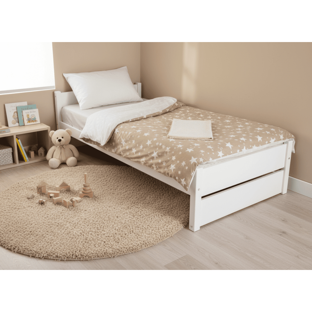 Jednoduchá, no elegantná posteľ POLA v bielej farbe je veľmi stabilná a odolná. Konštrukcia je vyrobená z borovicového dreva a v kombinácii s kvalitnou bielou MDF doskou bude slúžiť dlhé roky. Posteľ má v cene rolovací rošt, matrac je nutné doobjednať. Fotografie sú ilustračné, zásuvka pod posteľ nie je v cene, ale je možné ju doobjednať. Posteľ POLA značky Elvisia je vhodná do detskej izby alebo do spálne, neoľutujete.