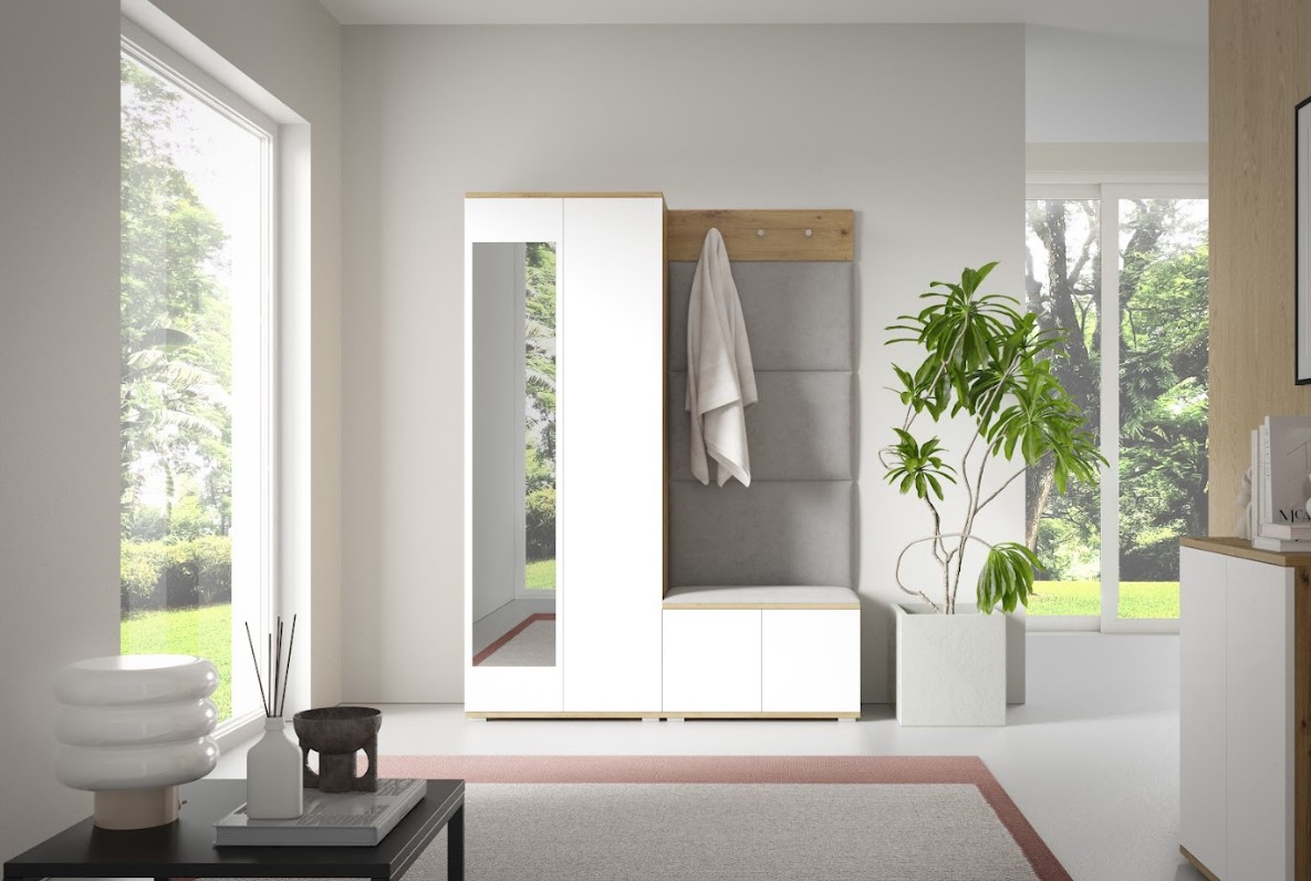 Zostava do predsiene SEVILLA v bielej farbe v kombinácií s dubom artisan je ideálna, ak si chcete zariadiť vstupnú chodbu vkusne a moderne. Elegantný nábytok v kombinácií s jemným čalúnením zapôsobí na každú návštevu. Okrem toho, že ponúka praktické riešenie pre uloženie topánok a kabátov, dodáva vstupu do domu jedinečný šmrnc.