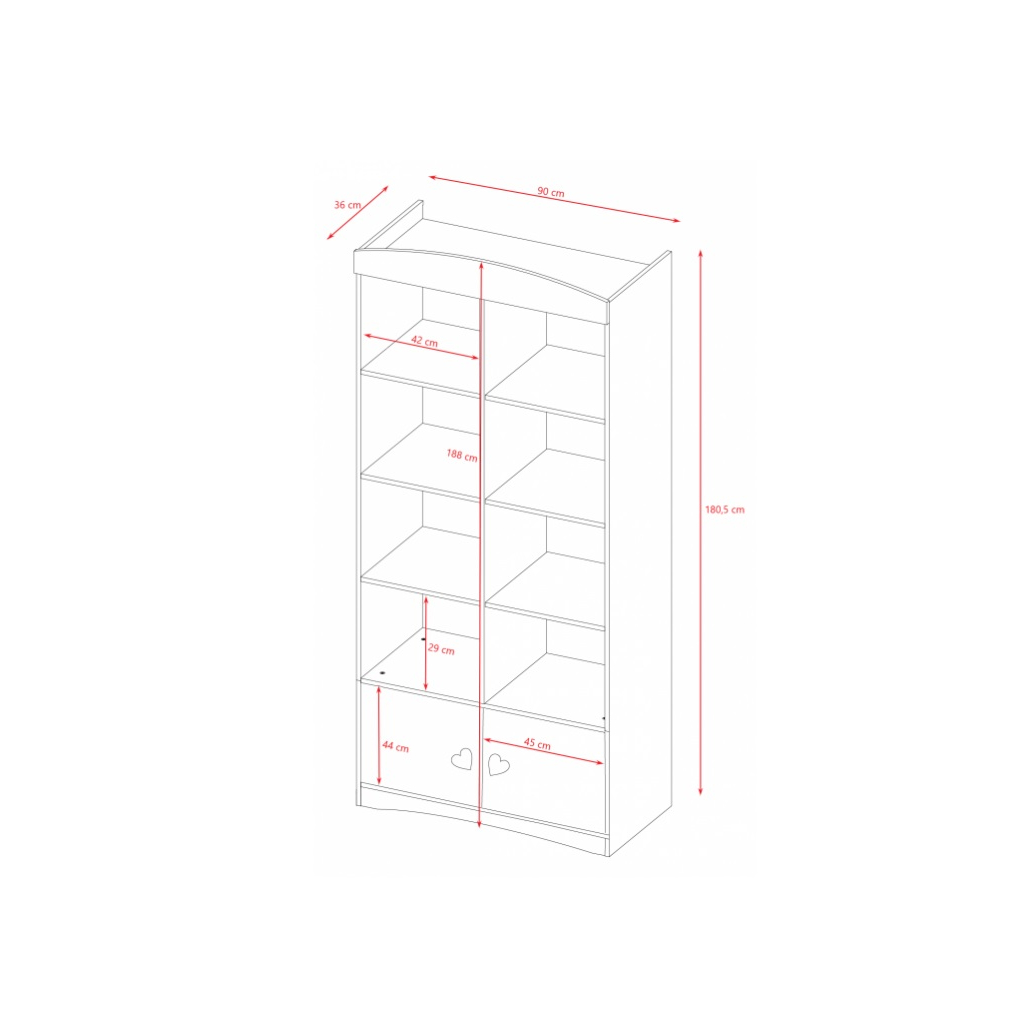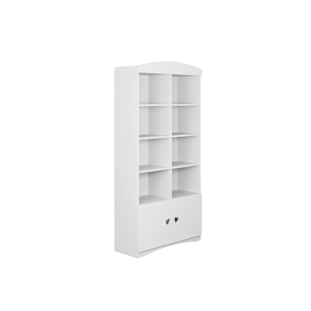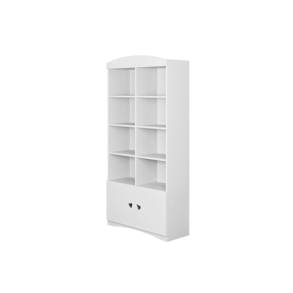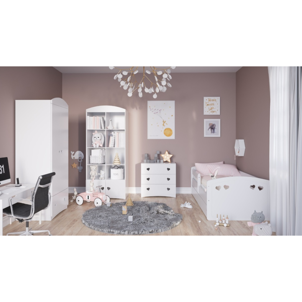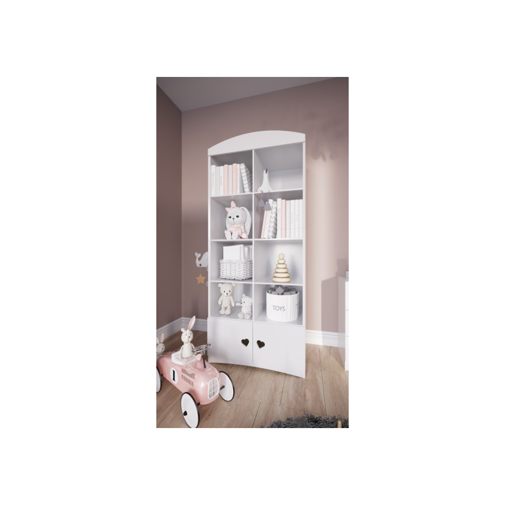 Regál JULIA v bielej farbe sa vyznačuje ľahkým, no zároveň elegantným dizajnom a pôvabnými úchytkami. Nábytok Julia spája praktickosť s jemnou estetikou a vytvára útulný, harmonický interiér. Precízne spracované detaily a premyslené prvky potešia najmenších členov domácnosti, zatiaľ čo rodičia ocenia zabudované bezpečnostné systémy. Biele prevedenie sa ľahko kombinuje s rôznymi štýlmi zariadenia a vnáša do priestoru sviežosť a ľahkosť. Úchytky sú riešené ako ozdobné výrezy v tvare srdca, ktoré dodávajú regálu jedinečný charakter. Vysoký regál má police a priestrannú skrinku napríklad na hračky.
