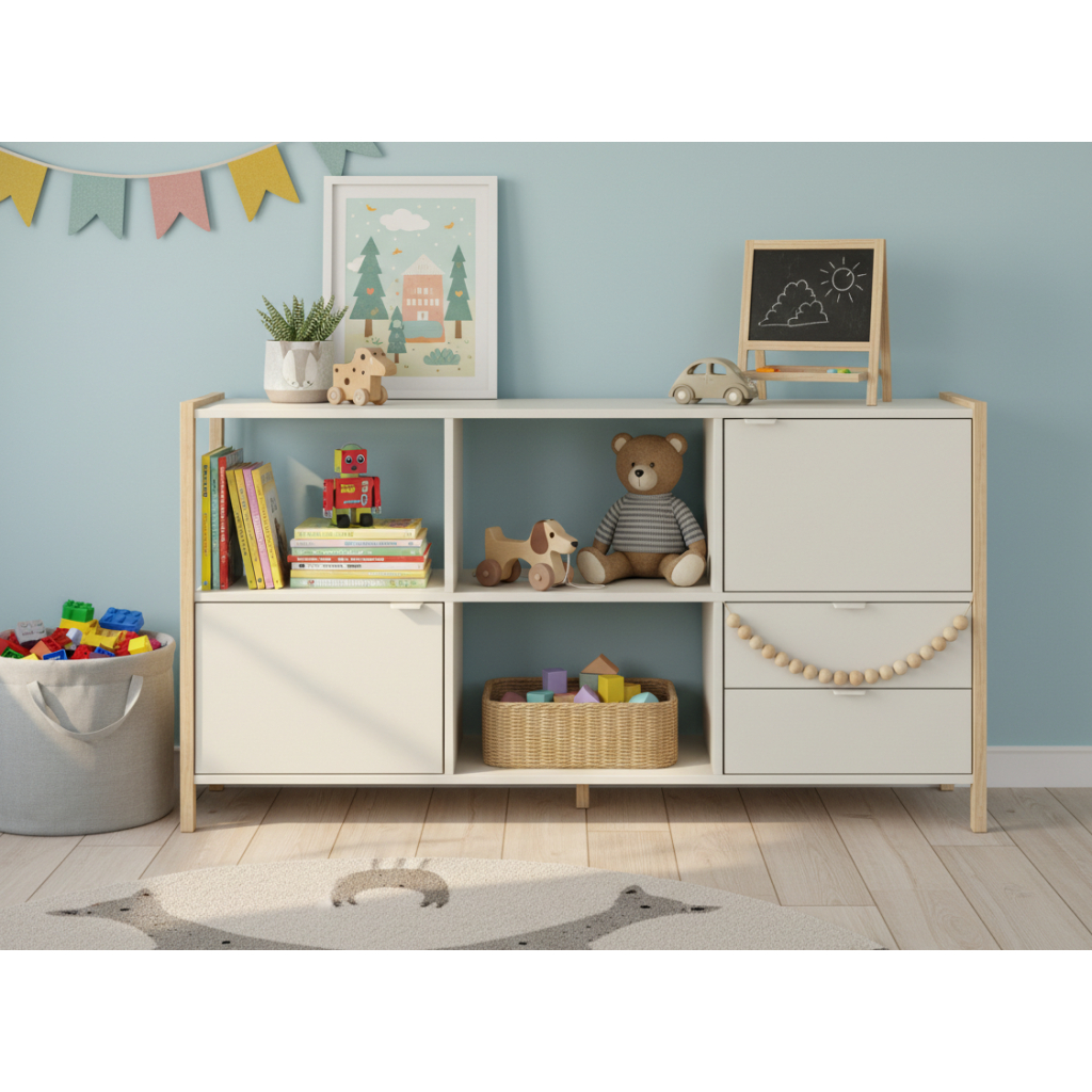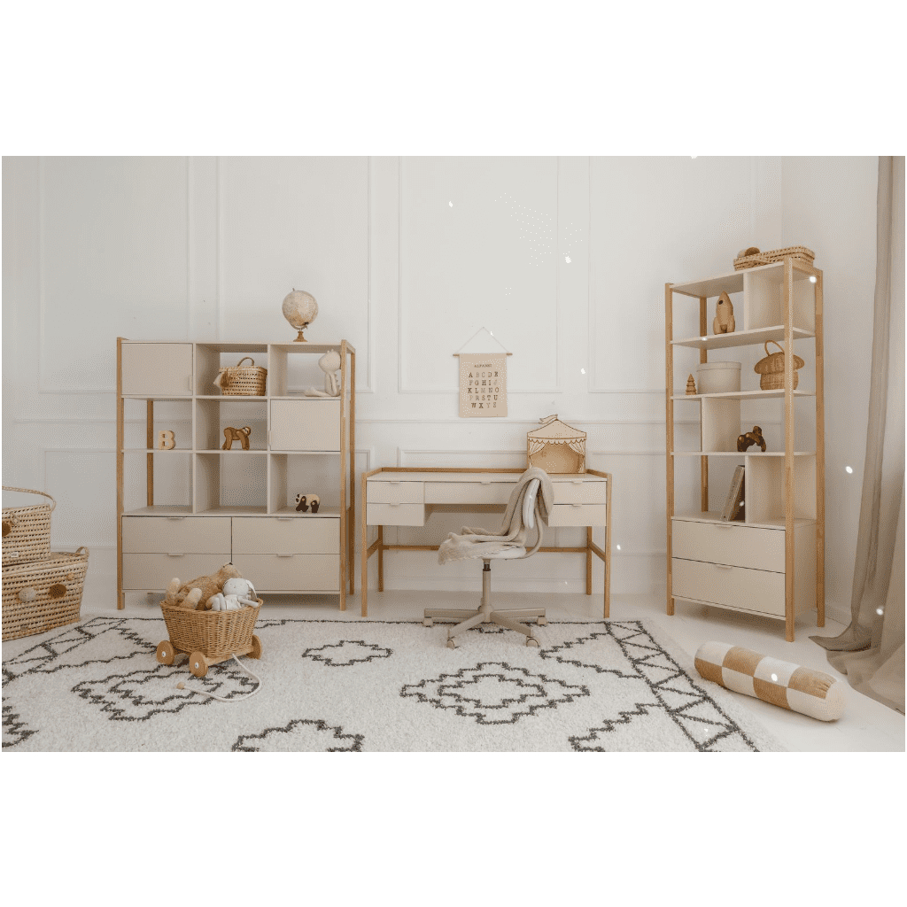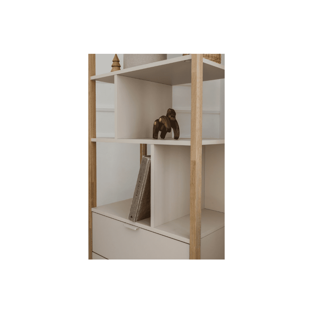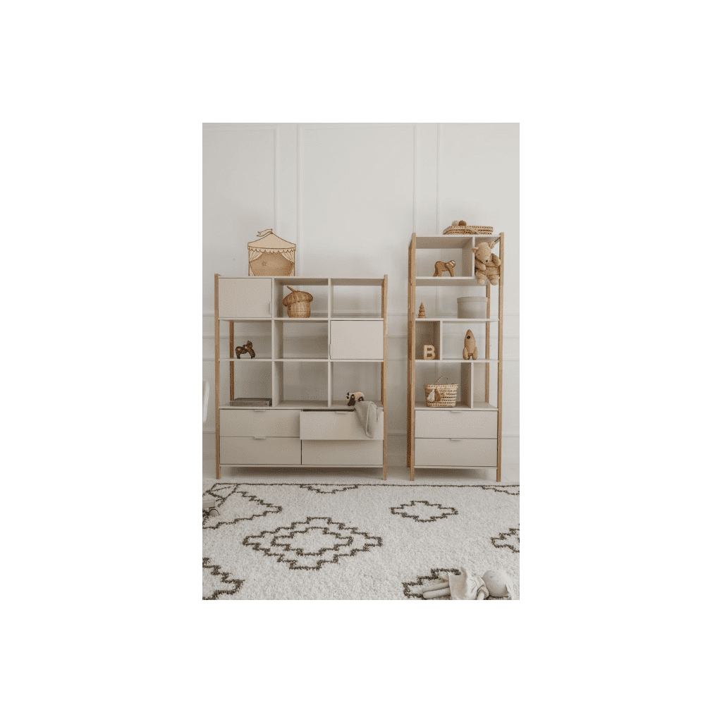 Praktický a dizajnový nízky široký regál VERSA je ideálnym doplnkom do detskej izby aj modernej domácnosti. Vďaka kombinácii svetlého odtieňa latte a prírodného dreva pôsobí sviežo, vzdušne a zároveň prináša dostatok priestoru na uskladnenie aj dekorovanie. Regál má dve zásuvky, dve dvierka a tri otvorené police. Regál VERSA vám pomôže vytvoriť prehľadný a organizovaný priestor, kde budú všetky veci na dosah ruky. Vďaka nadčasovému dizajnu je nielen praktickým riešením, ale aj elegantným doplnkom interiéru. Vyberte si široký regál VERSA a spojte funkčnosť s modernou estetikou.