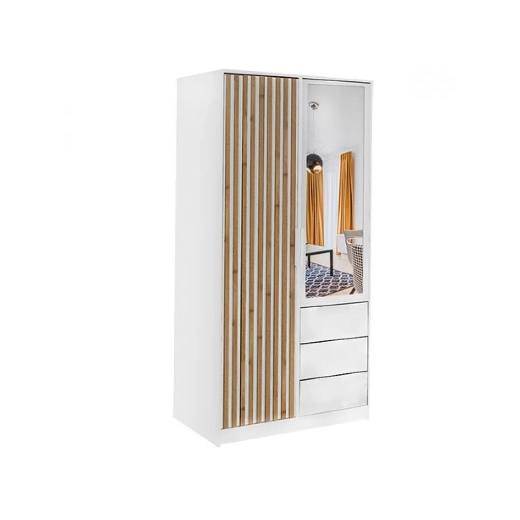 Priestranná šatníková skriňa BALI LUX D2 s nadstavcom je výbornou voľbou do každej spálne, ktorá potrebuje množstvo úložného priestoru. Skriňa je vyrobená v obľúbenom dekore dub wotan v kombinácii s bielou, ktorú ozvláštňujú lamely, tieto sú veľkým hitom. Šatníková skriňa BALI LUX D2 je dvojdverová a má 3 zásuvky.