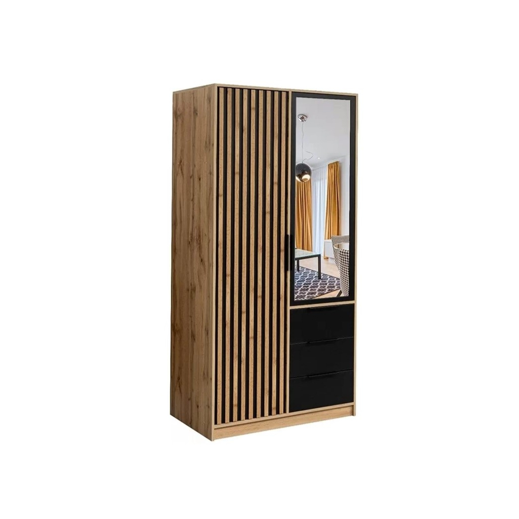 Priestranná šatníková skriňa BALI LUX D2 s nadstavcom je výbornou voľbou do každej spálne, ktorá potrebuje množstvo úložného priestoru. Skriňa je vyrobená v obľúbenom dekore dub wotan v kombinácii s čiernou, ktorú ozvláštňujú lamely, tieto sú veľkým hitom. Šatníková skriňa BALI LUX D2 je dvojdverová a má 3 zásuvky.