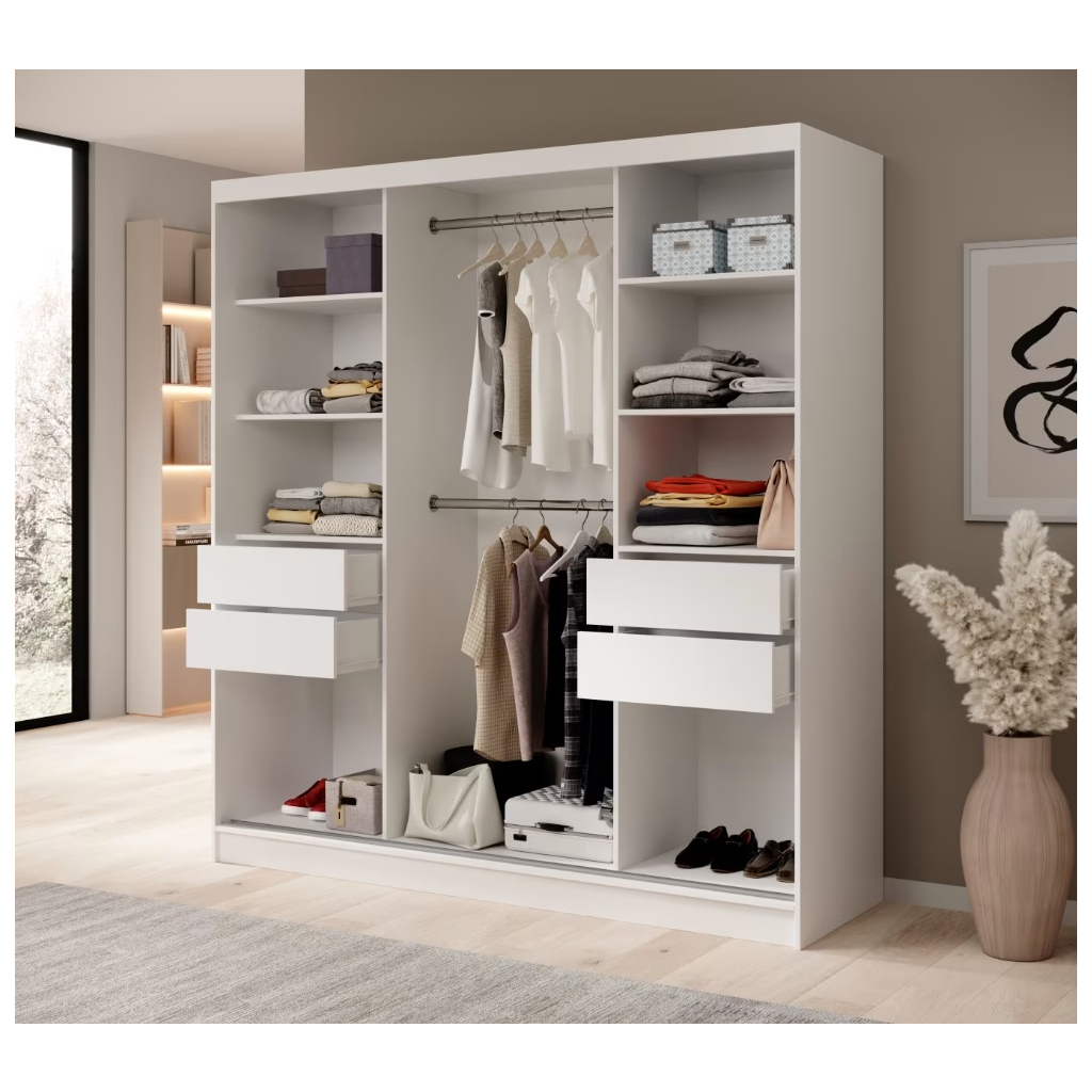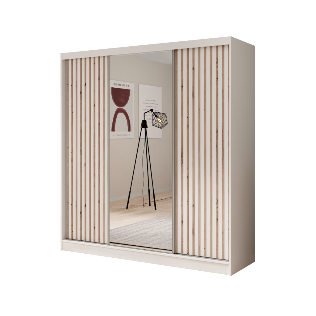 Šatníková skriňa IDA so zrkadlom a lamelami je moderné a elegantné riešenie pre každého, kto hľadá spojenie funkčnosti a štýlu. Vďaka šírke 200 cm sa hodí do priestranných spální, chodieb či šatní a poskytuje dostatok miesta na oblečenie aj doplnky. Posuvné dvere umožňujú pohodlné používanie aj v menších priestoroch, zatiaľ čo centrálne umiestnené zrkadlo opticky zväčší miestnosť a uľahčí každodenné prípravy. Prednú časť skrine zdobia elegantné lamely, ktoré vnášajú do interiéru teplo dreva a dodávajú skrini moderný charakter. Skriňa je v neutrálnom bielom prevedení s lamelami.