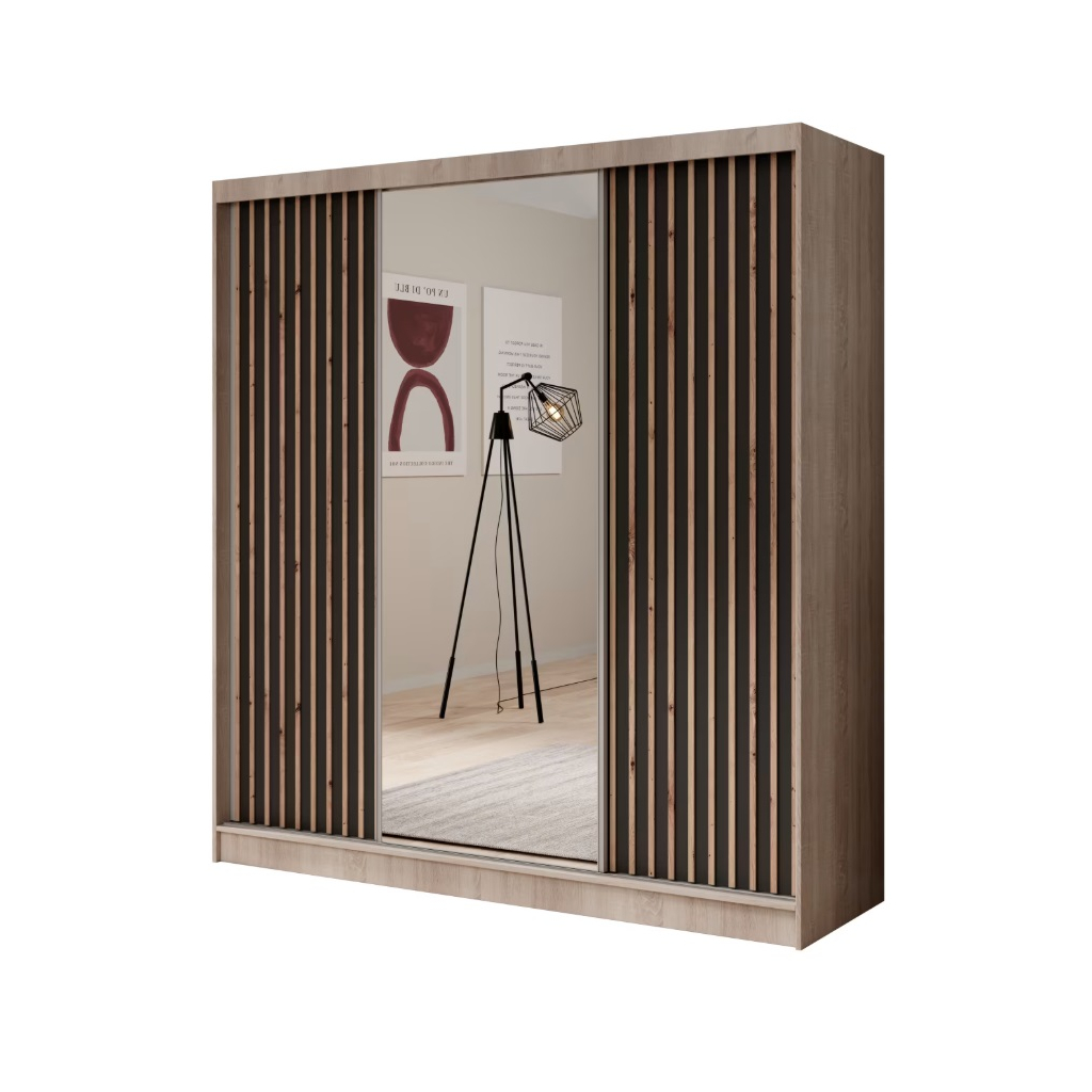 Šatníková skriňa IDA so zrkadlom a lamelami je moderné a elegantné riešenie pre každého, kto hľadá spojenie funkčnosti a štýlu. Vďaka šírke 200 cm sa hodí do priestranných spální, chodieb či šatní a poskytuje dostatok miesta na oblečenie aj doplnky. Posuvné dvere umožňujú pohodlné používanie aj v menších priestoroch, zatiaľ čo centrálne umiestnené zrkadlo opticky zväčší miestnosť a uľahčí každodenné prípravy. Prednú časť skrine zdobia elegantné lamely, ktoré vnášajú do interiéru teplo dreva a dodávajú skrini moderný charakter. Skriňa je trojdverová prevedení dub sonoma s kombináciou bielej.