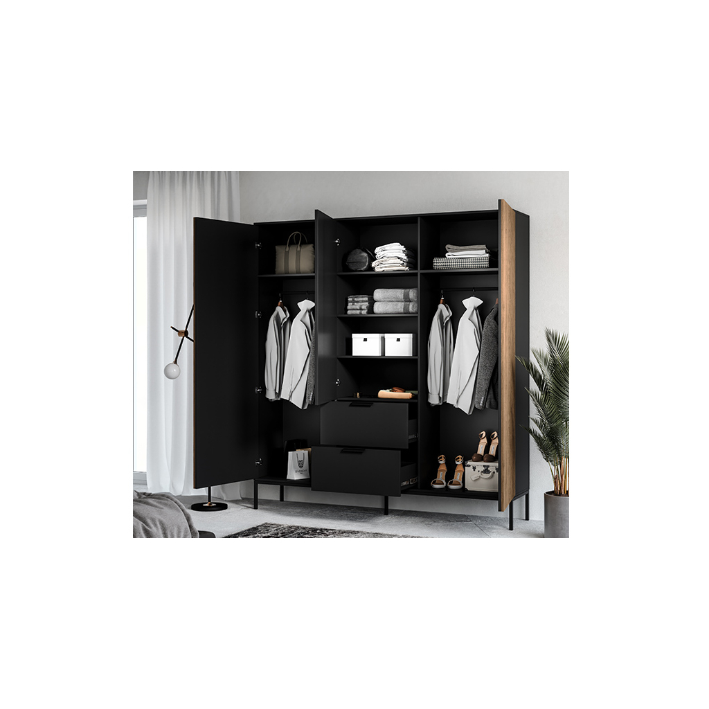 Kolekcia nábytku MEORATI je ideálnym doplnkom do vašej spálne aj obývačky. Váš interiér oživí farebné prevedenie čierneho matného povrchu kombinovaného s dubom artisan. Kovové čierne nohy s výškou 20 cm zabezpečujú stabilitu. Čelá nábytku s frezovanými detailmi vo farbe dub artisan podčiarkujú prirodzenú krásu a charakter dreva, celkový dojem dotvárajú pútavé rukoväte v matnej čiernej farbe. Kolekcia nábytku MEORATI je dokonalým spojením elegancie a trvácnej kvality pre vašu domácnosť. Celý nábytok je vyrobený z kvalitnej laminovanej dosky v hrúbke 16 mm. Šatníková skriňa Meorati ponúka nielen estetický dizajn, ale aj praktické úložné riešenia. Za oboma pármi dverí sú police, zásuvky a tyče, ktoré umožňujú efektívnu organizáciu a poriadok vo vnútri skrine. Dvere sú vybavené robustnými pántmi zaisťujú plynulé otváranie a zatváranie skrine.
