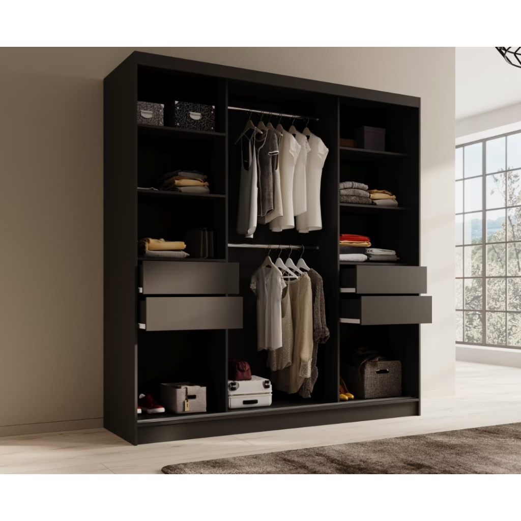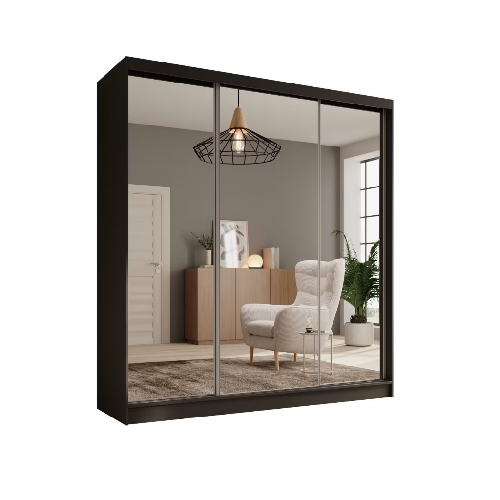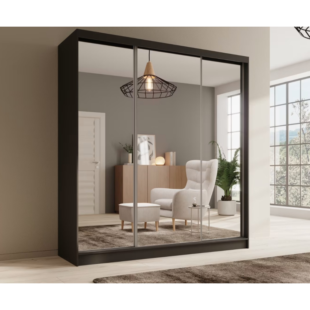 Čierna šatníková skriňa TOLA so zrkadlami spája moderný dizajn s vysokou praktickosťou. So šírkou 200 cm ponúka veľkorysý úložný priestor, v ktorom prehľadne usporiadate oblečenie, posteľnú bielizeň aj ďalšie domáce potreby. Zrkadlá opticky zväčšia miestnosť a dodajú jej svetlejší, vzdušnejší vzhľad. Posuvné dvere umožňujú úsporu miesta, vďaka čomu je skriňa ideálna pre menšie miestnosti alebo úzke predsiene.
