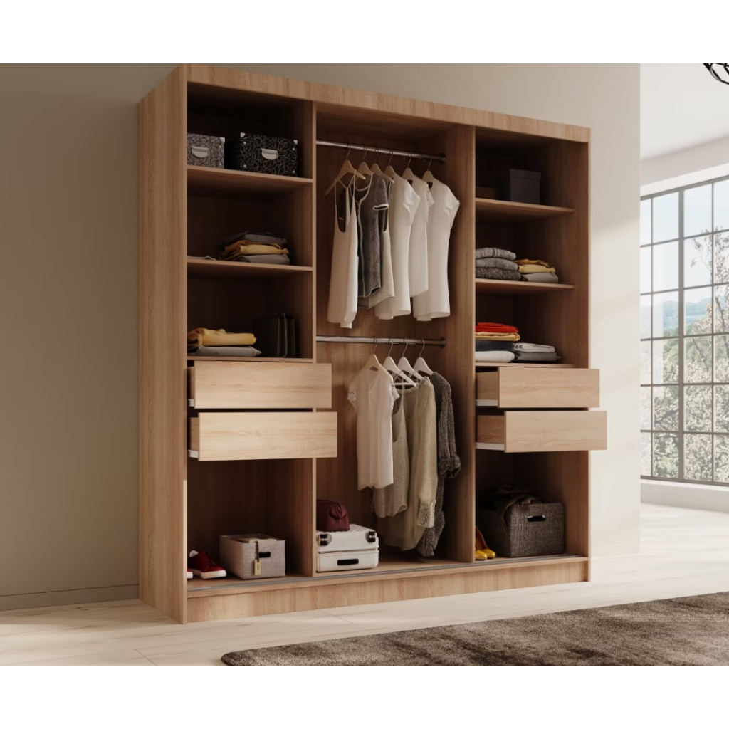 Šatníková skriňa TOLA so zrkadlami vo farebnom prevedení dub sonoma spája moderný dizajn s vysokou praktickosťou. So šírkou 200 cm ponúka veľkorysý úložný priestor, v ktorom prehľadne usporiadate oblečenie, posteľnú bielizeň aj ďalšie domáce potreby. Zrkadlá opticky zväčšia miestnosť a dodajú jej svetlejší, vzdušnejší vzhľad. Posuvné dvere umožňujú úsporu miesta, vďaka čomu je skriňa ideálna pre menšie miestnosti alebo úzke predsiene.