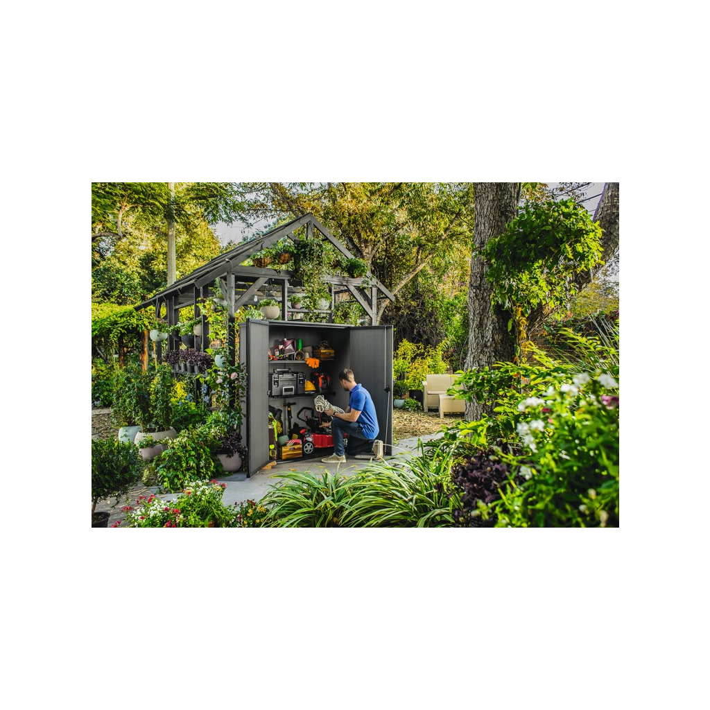 Bezúdržbová a veľmi praktická záhradná skrinka AMPEZZO ALTO je ideálna nielen na uschovávanie náradia a záhradných doplnkov, ale aj na kosačku alebo grill. Domček v modernom prevedení je ideálny ma každú záhradu.