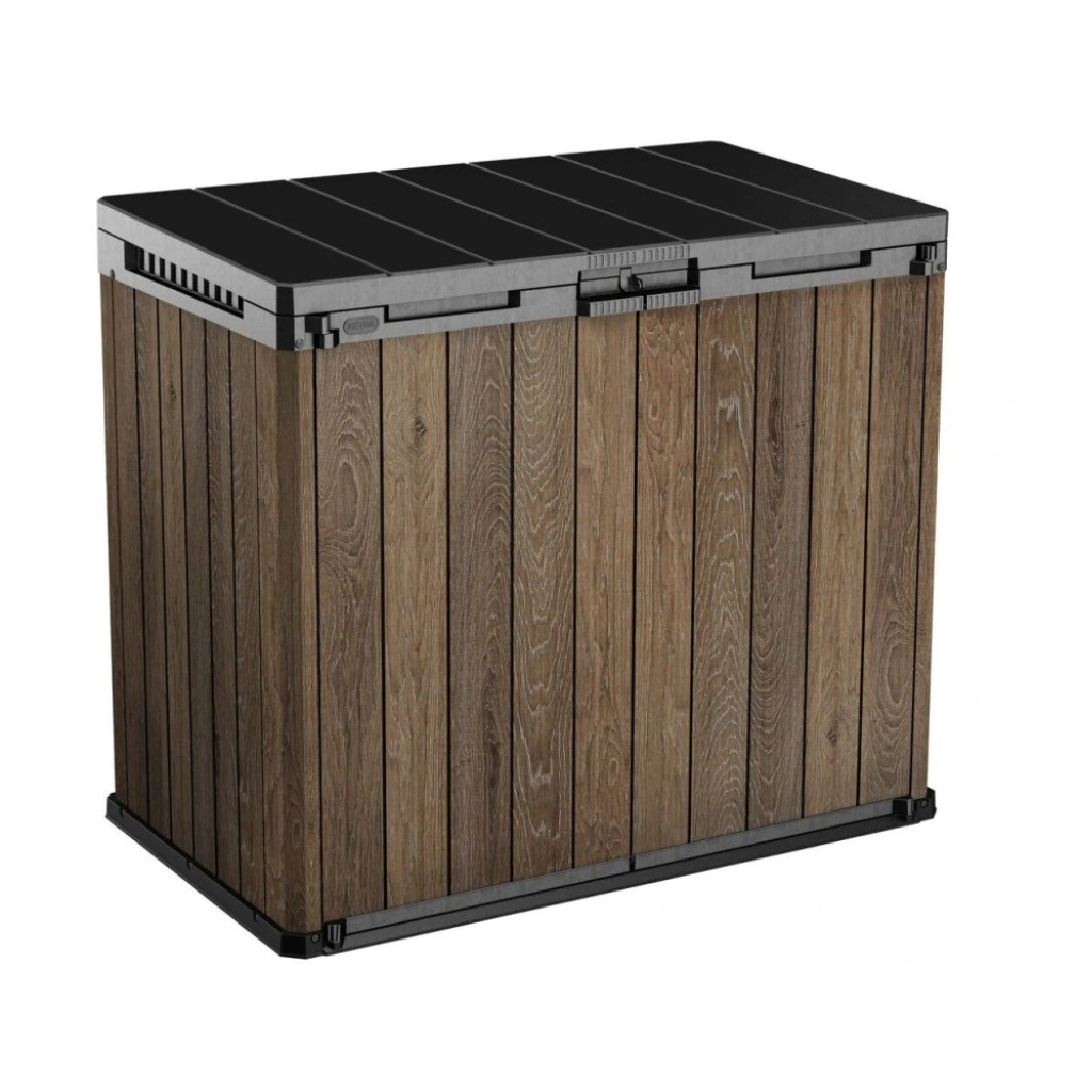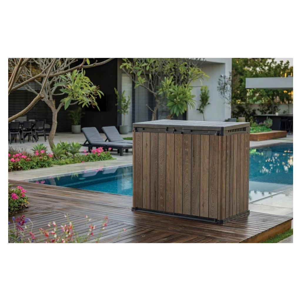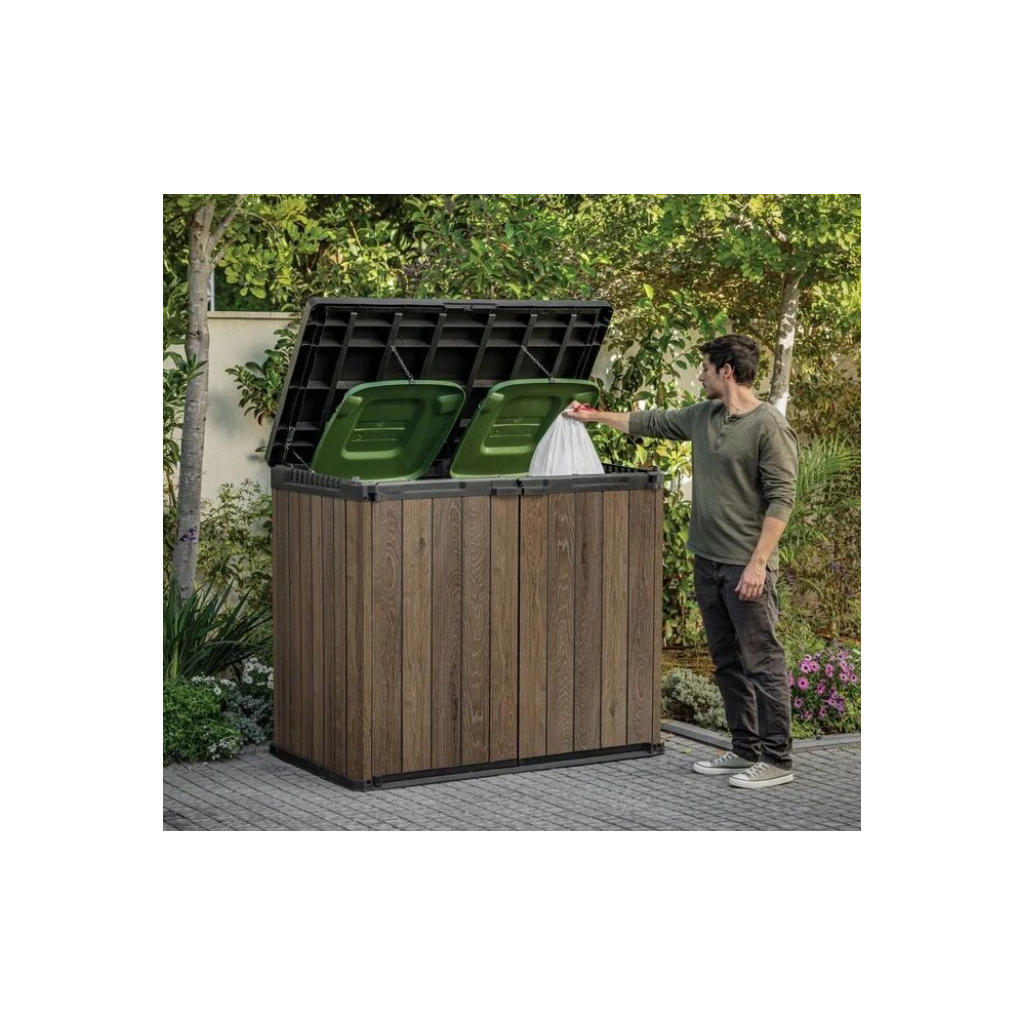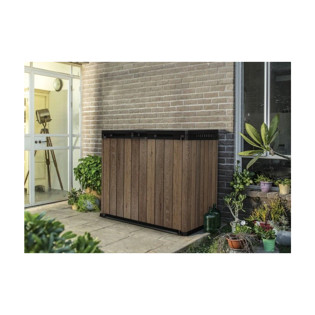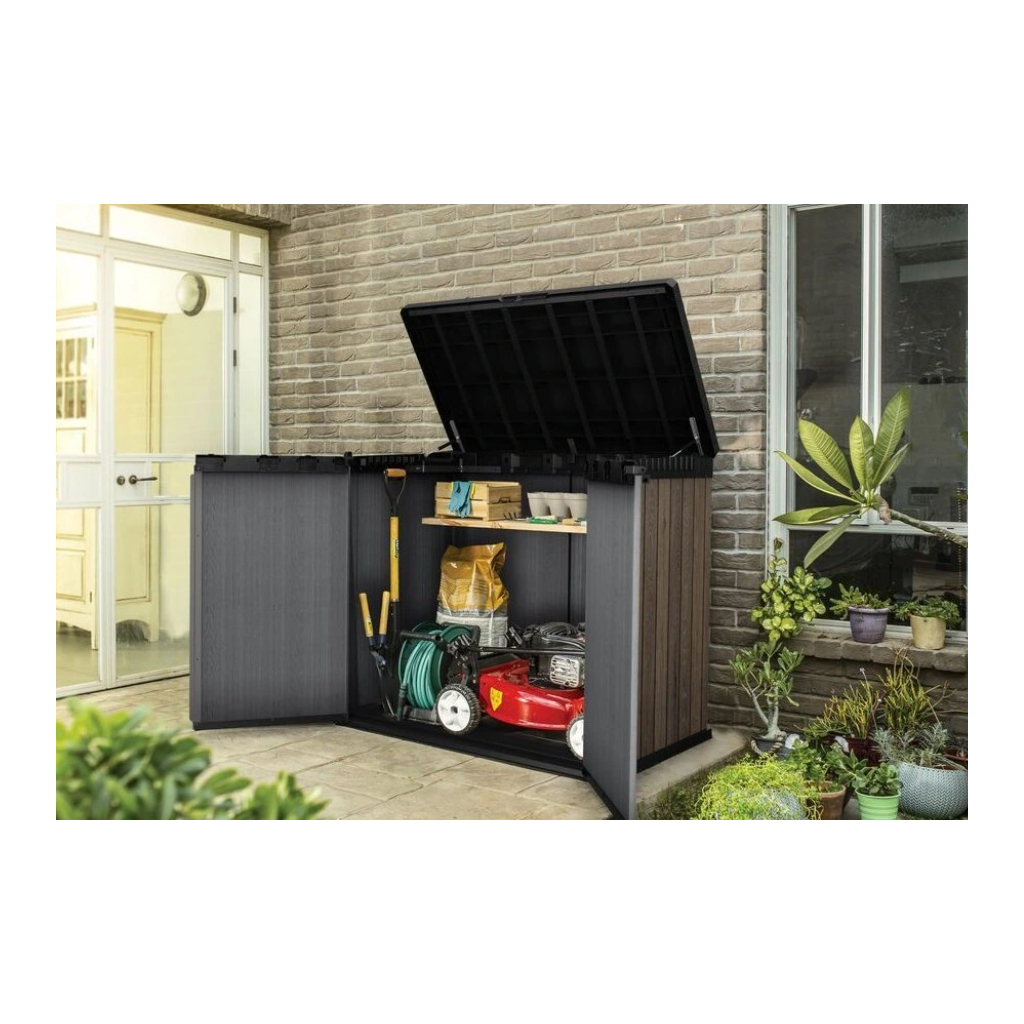 Záhradná skrinka STORE IT 1150 L ponúka vzhľad dreva v rôznych odtieňoch, moderný a zároveň praktický box bude štýlovým doplnkom na každú záhradu alebo terasu. Skrinka má bohatý úložný priestor v objeme 1150L na uskladnenie záhradného náradia, grilovacích pomôcok alebo smetných nádob. Otváranie je zabezpečené formou hydraulických piestov, súčasťou balenia sú aj retiazky na uchytenie vrchnákov smetných nádob. Zabudovaná ventilácia chráni skrinku pred nepríjemnými pachmi. Záhradná skrinka má možnosť uzamknutia visiacim zámkom (zámok nie je súčasťou balenia).