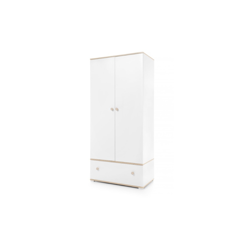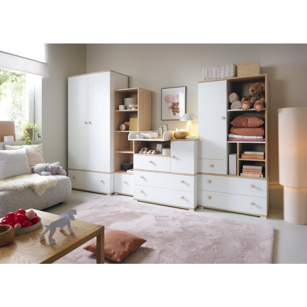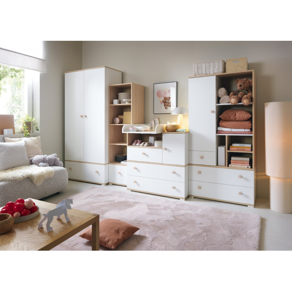 Šatníková skriňa ZOYA ZY01 je praktický a štýlový kus nábytku vhodný do každej detskej izby. Nábytok je navrhnutý pre najmenších s dôrazom na bezpečnosť, kvalitné spracovanie a nadčasový vzhľad. Systém ponúka čistý, jednoduchý dizajn, ktorý rastie spolu s dieťaťom. Vďaka minimalistickému štýlu môžete izbu jednoducho meniť pomocou dekorácií, napríklad samolepkami. Nábytok je vyrobený v bielej farbe s prírodným dreveným dekorom, takže pôsobí moderne a útulne. Šatníková skriňa ponúka veľa úložného priestoru, má priestrannú zásuvku, policu a vešiakovú tyč. Oblečenie, hračky či knihy tak budú vždy upratané a poruke. Jednoduchý dizajn umožňuje ľahké kombinovanie s ďalším nábytkom.