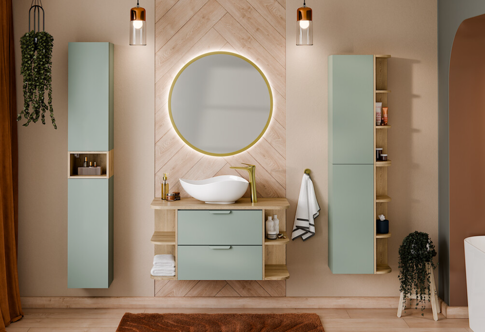 Objavte elegantnú kúpeľňovú zostavu ASTER GREEN, ktorá spája jemnú mätovú farbu s prírodným dekorom dreva a vytvára harmonický, nadčasový interiér. Táto moderná kúpeľňa je ideálnou voľbou pre všetkých, ktorí hľadajú kombináciu funkčnosti, estetiky a kvalitného spracovania. Táto kompletná kúpeľňová zostava je ideálna do moderných bytov aj rodinných domov. Vytvorte si kúpeľňu, ktorá bude pôsobiť útulne, štýlovo a zároveň prakticky.