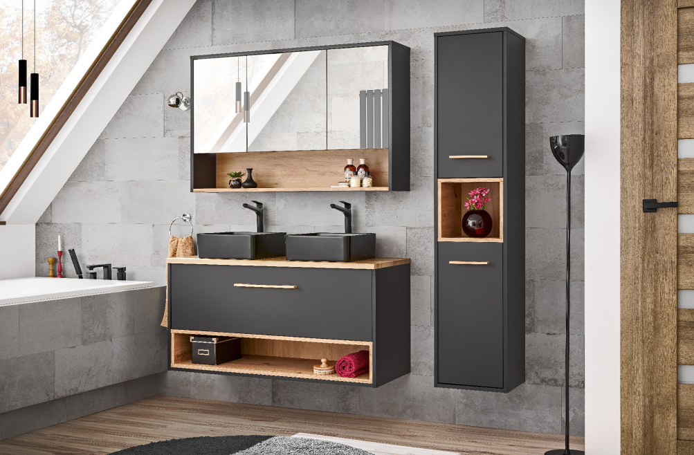 So skrinkami do kúpeľne BORNEO COSMOS neprinášate do svojej kúpeľne len úložný priestor, ale aj štýl, ktorý dotvorí váš osobný priestor s eleganciou a sofistikovanosťou. Kombinácia sivej a dekoru dub artisan vytvára atmosféru moderného luxusu. Každý detail dizajnu je premyslený a prepracovaný tak, aby poskytoval maximálnu funkčnosť a estetiku. Zostava obsahuje skrinky pod umývadlo, zrkadlové skrinky a vysokú kúpeľňovú skrinku. Urobte z vašej kúpeľne miesto, kde sa budete cítiť nielen pohodlne, ale aj štýlovo.