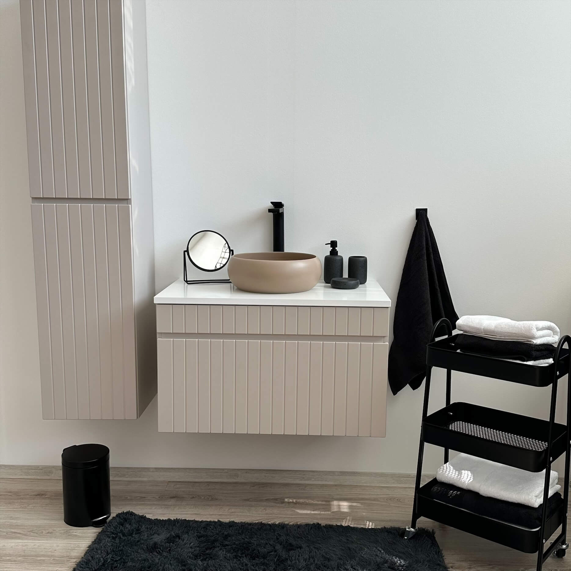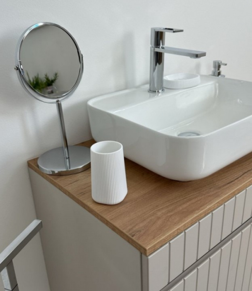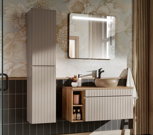 Kúpeľňová zostava ICONIC CASHMERE je skutočnou ikonou v kúpeľni. Jej zvislé frézovanie dodáva zostave jedinečný vzhľad, zatiaľ čo kombinácia kašmíru s drevom pridáva teplo a prirodzenosť. Štýlová funkčná zostava ICONIC môže zmeniť celkovú atmosféru v kúpeľni a dodá jej pocit luxusu. Skvelo sa hodí do tmavých aj svetlých kúpeľni, ľahko sa kombinuje. Ak hľadáte spôsob ako zdokonaliť vašu kúpeľňu a pridať do nej štýlový prvok, ICONIC CASHMERE je tou správou voľbou.