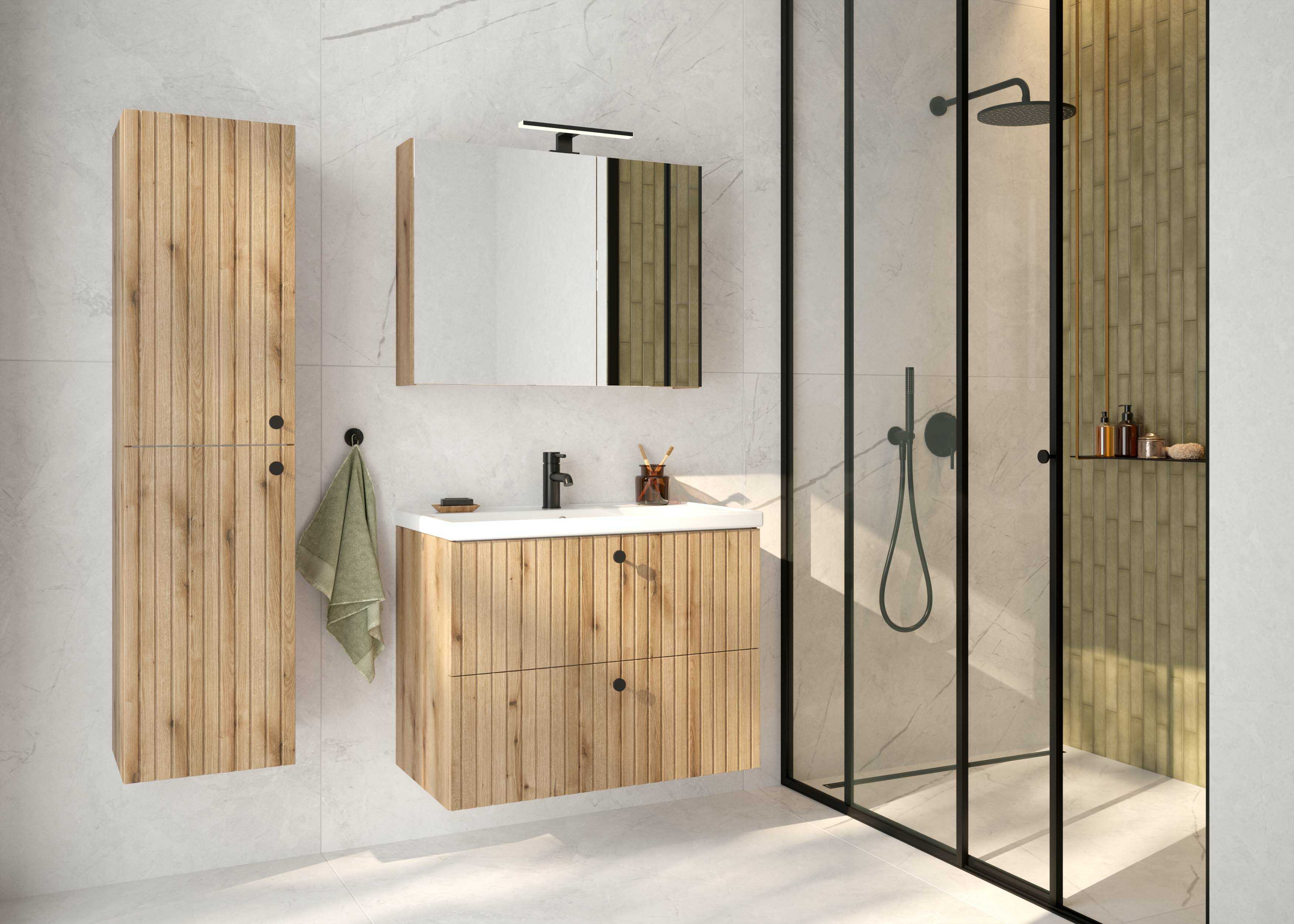 Hľadáte kúpeľňový nábytok, ktorý skvele vyzerá a zároveň vydrží dlhé roky? Kúpeľňové skrinky RIETTI OAK EVOKE vznikli spojením odolných materiálov, moderného dizajnu a praktických detailov. Čierne kovové úchytky dodávajú skrinkám moderný industriálny vzhľad a zaručujú pohodlné používanie. Nezáleží na tom, či máte veľkú alebo malú kúpeľňu – kúpeľňové skrinky RIETTI OAK EVOKE ponúkajú praktické riešenia pre každý priestor. Vytvorte si modernú a funkčnú kúpeľňu s nábytkom, ktorý spája kvalitu a eleganciu.