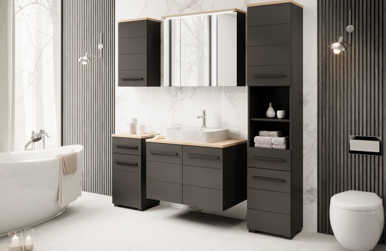 Kolekcia kúpeľňového nábytku SWING má matný čierny povrch v harmónii s prirodzeným dubom artisan, ktorý prináša elegantný a moderný dizajn. Zostava SWING je skvelou voľbou pre tých, ktorí uprednostňujú dekory s decentným vzhľadom. Ak si chcete vytvoriť harmonický interiér, kombinujte zostavu so svetlými dlažbami alebo kameňom.