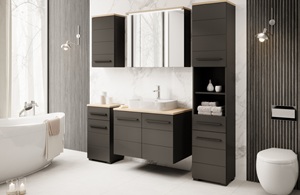 Nevšedný antracitový a čierny nábytok dodá vašej kúpeľni hĺbku a podmanivý nádych luxusu. Populárnym riešením do kúpeľne sú i moderné skrinky v tlmených alebo pastelových farbách ako je napríklad mentolová modrá. Kúpeľňové skrinky upokojujúcej sivej farby ľahko zladíte s akoukoľvek farebnou paletou. Veľké zrkadlo nad umývadlom alebo šikovná zrkadlová kúpeľňová skrinka vám pomôžu vyťažiť maximum z priestoru malej kúpeľne. Zrkadlo s integrovaným LED osvetlením poslúži v kúpeľni ako doplnkový zdroj príjemného rozptýleného osvetlenia, ktoré oceníte najmä pri úprave zovňajšku.