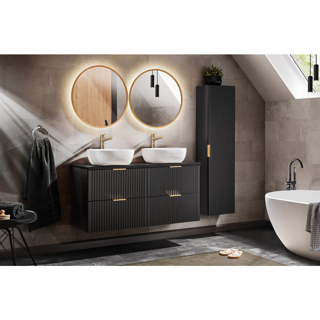 Dokonalá zostava do kúpeľne ADEL black v čiernej farbe sa ideálne hodí do modernej aj klasickej kúpeľne a jeho vysoká funkčnosť zaistí komfort aj tým najnáročnejším užívateľom. Skrinka pod umývadlo ADEL Black 81-40 má jedny dvierka s tichým dovieraním s košom. Minimalistické prevedenie oživujú vertikálne drážkované čelá, ktoré sú moderné a žiadané. Výhodou je aj možnosť výberu farby úchytiek, pretože každá skrinka je dodávaná s tromi farebnými úchytmi: zlatý lesk, chrómový lesk a čierny mat. Vďaka tomu je možné farebne doladiť úchytky ku kovaniu, zrkadlá v rôznych farbách rámu, či osviežiť vzhľad nábytku v budúcnosti.