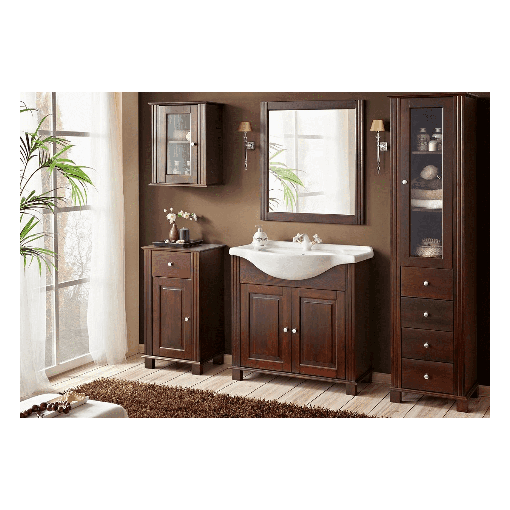 Exkluzívne skrinky do kúpeľne RETRO v retro štýle vyrobené z najkvalitnejšieho borovicového dreva v nádhernej tmavo hnedej farbe kombinujú tradičné remeselné spracovanie s moderným nádychom. Borovicové drevo, z ktorého sú kúpeľňové skrinky vyrobené, dodáva kúpeľni zvláštny nádych štýlu a elegancie. Vysoká kúpeľňová skrinka RETRO 800 má jedny presklené dvierka a štyri zásuvky. Oživte si domov nostalgickým duchom a nechajte sa uniesť atmosférou minulých dní.
