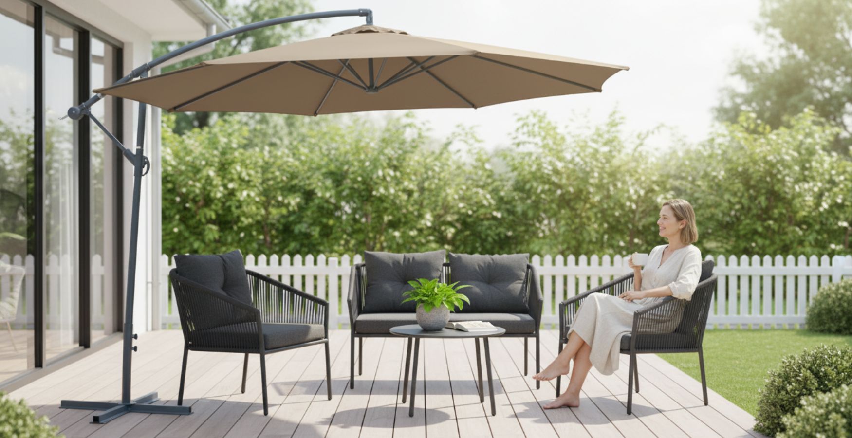 Hľadáte dokonalý slnečník na záhradu, pod ktorým si môže posedenie v tieni vychutnávať aj väčšia spoločnosť, napríklad počas rodinných osláv? Originálnym riešením je moderný slnečník s dvomi ramenami, ktorý komfortne zatieni aj veľký oválny stôl a ochráni vašich blízkych pred príliš horúcimi slnečnými lúčmi aj pred letným mrholením.