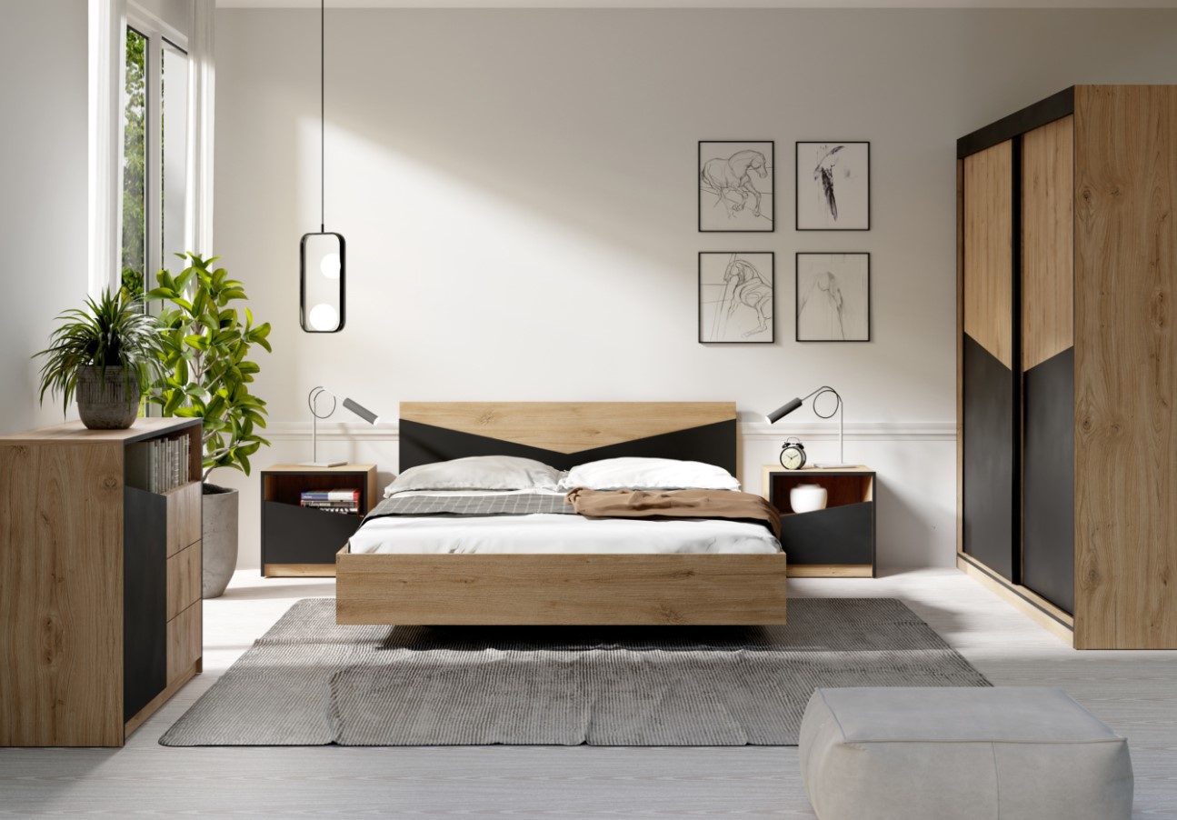 Spálňa Atson v dubovom prevedení je skvelým doplnkom do rôznych interiérov - od klasického štýlu, cez škandinávsky, až po moderný dizajn. Predstavuje ideálnu voľbu pre tých, ktorí hľadajú spojenie funkčnosti a estetického vzhľadu, čím vytvoria harmonický a praktický priestor vo svojom domove. Nábytok je v príjemnej farbe dubu s kombináciou béžovej alebo čiernej matnej.