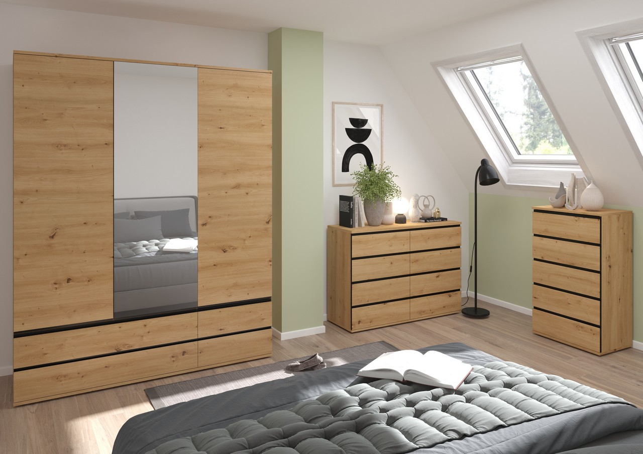 Kolekcia NAXOS v príjemnom prevedení bola navrhnutá tak, aby zapadla do spálne aj do obývačky. Farebná kombinácia dub artisan s čiernou príjemne zútulnia každý priestor. Oceníte bezúchytový systém otvárania zásuviek a dvierok. Vďaka množstvu prvkov si vyskladáte dokonalú zostavu aj u vás doma, podľa vlastných predstáv.