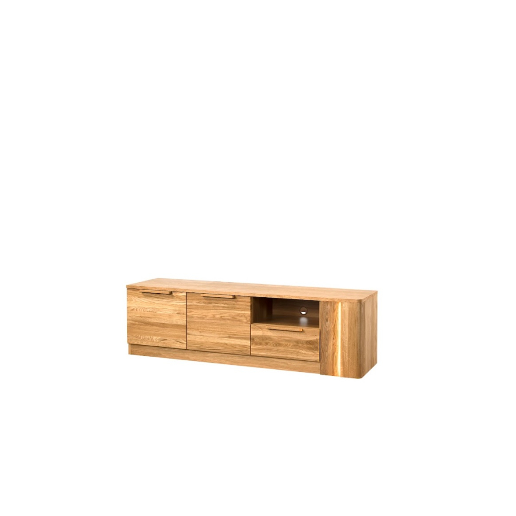 Tv stolík je vyrobený z kvalitných materiálov, ktoré spájajú prírodnú krásu dreva s praktickosťou moderných povrchov. Vďaka tejto kombinácii pôsobí nábytok elegantne, odolne a nadčasovo. Čelné plochy sú zhotovené z masívneho dubového dreva, ktoré vyniká prirodzenou štruktúrou a teplým odtieňom. Povrch je ošetrený prírodným olejom, ktorý zvýrazňuje kresbu dreva, chráni ho pred vlhkosťou a zachováva jeho autentický vzhľad. Korpus a vnútorné časti sú vyrobené z kvalitnej drevotriesky s odolnou melamínovou a fóliovou povrchovou úpravou. Táto kombinácia zaručuje pevnosť, stabilitu a jednoduchú údržbu, povrch je odolný voči poškriabaniu a každodennému používaniu. Dekoratívne sklenené prvky dodávajú nábytku ľahkosť a moderný vzhľad, čím elegantne dopĺňajú celkový dizajn. Spojenie masívu, drevotriesky a skla prináša dokonalú rovnováhu medzi prírodným štýlom, funkčnosťou a dlhou životnosťou.