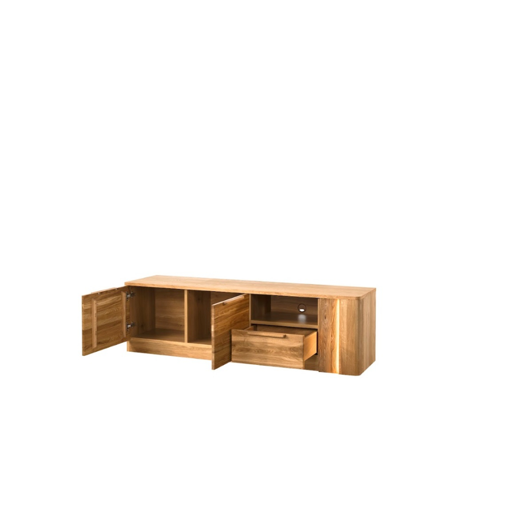 Tv stolík LONDON 25 z masívneho dreva je dokonalým príkladom toho, ako môže prírodný materiál premeniť interiér na miesto s dušou. Vyniká luxusným vzhľadom a precíznym spracovaním, ktoré z nej robí nadčasový kúsok vhodný do moderného aj klasického priestoru. Pánty s tichým zatváraním zabezpečujú pohodlné používanie bez rušivého hluku, vďaka čomu Tv stolík pôsobí rovnako luxusne, ako vyzerá. Jedinečnou súčasťou je aj integrované LED osvetlenie, ktoré vytvára príjemnú atmosféru v miestnosti. Teplé svetlo krásne zvýrazní štruktúru dreva a prinesie do vášho domova pocit útulnosti a harmónie ideálne na večerný oddych. Tv stolík má praktický otvor na káble.