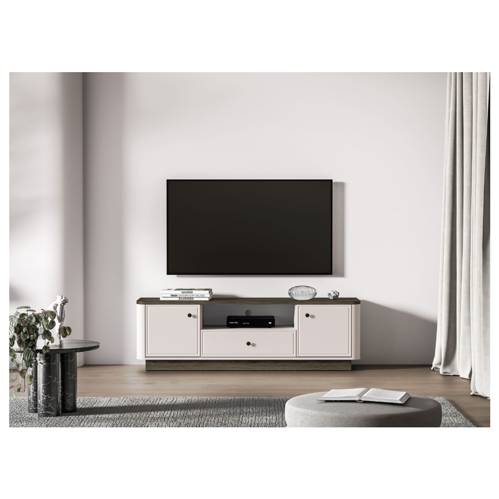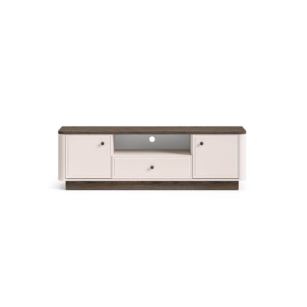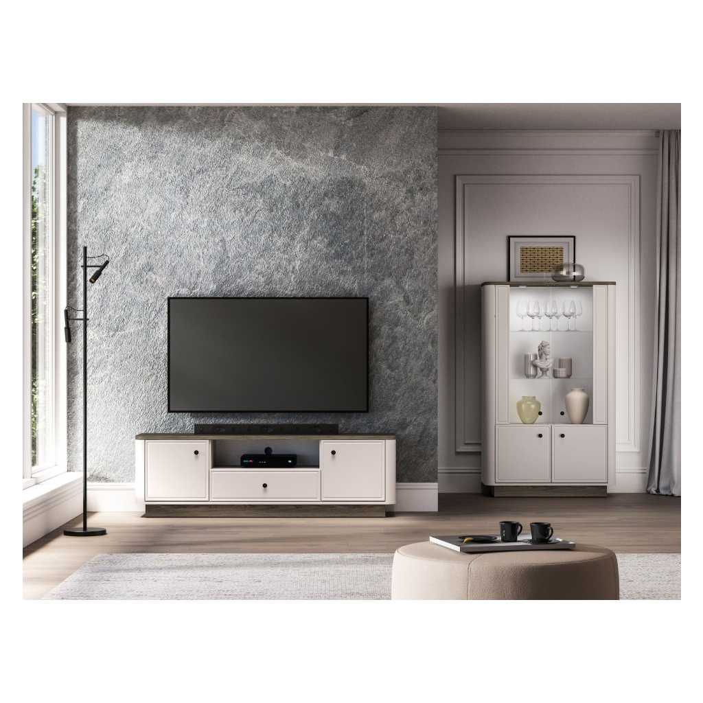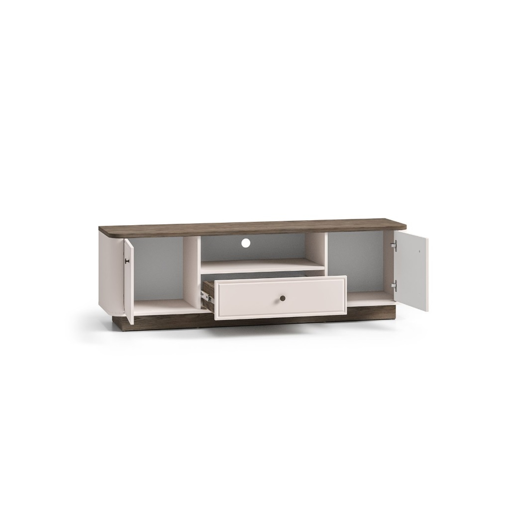 Objavte nábytok OLIVAVI, ktorý kombinuje eleganciu, štýl a funkčnosť. Táto kolekcia je ideálna do obývacích izieb, pričom jej dizajn okamžite zaujme jemne zaoblenými prechodmi medzi korpusom a čelami nábytku. Kontrastné kombinácie dekorov klasický kašmírový a tmavo tónovaný dub Windmill dodávajú nábytku moderný a luxusný vzhľad. Vkusné kovové úchytky pridávajú nábytku eleganciu a sofistikovanosť. S nábytkom získate do svojho interiéru noblesu, štýlovosť a vysokú kvalitu, ktorá pozdvihne každý priestor. TV stolík OLIVAVI 05 je priestranný so skrinkami a zásuvkou, ktoré majú plný výsuv. Taktiež má stolík praktický otvor na káble.