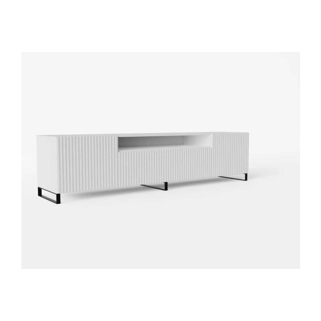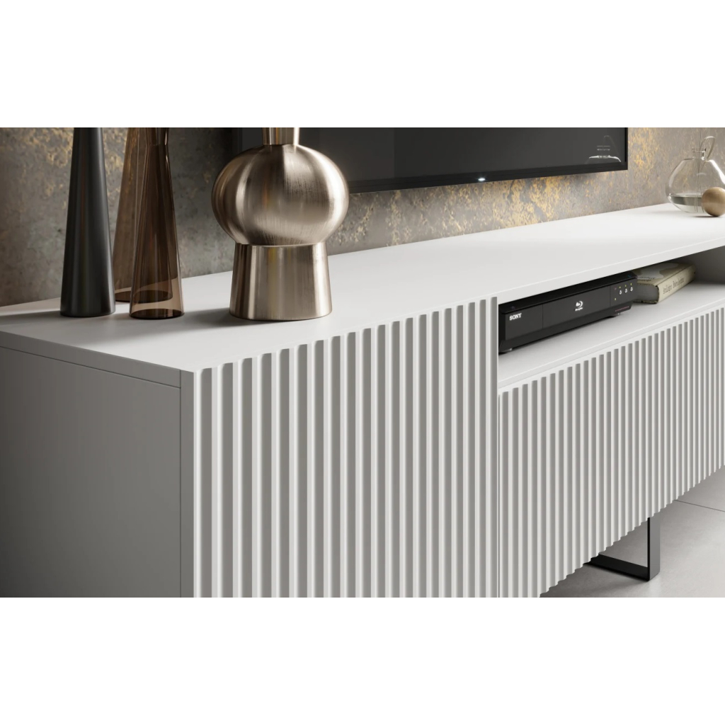 TV stolík NOEMI je štýlový a praktický kus nábytku, ktorý dokonale doplní modernú obývačku. Elegantný dizajn s ryhovaným čelom pôsobí luxusne a zároveň nadčasovo. Premyslené vnútorné usporiadanie ponúka dostatok priestoru na televíznu techniku, príslušenstvo aj drobnosti. Stabilná konštrukcia, kovové nohy v čiernom matnom prevedení a systém otvárania zabezpečujú pohodlné a tiché používanie každý deň. Tv stolík v prevedení biela matná s kombináciou čiernych nôh má dĺžku 200 cm.