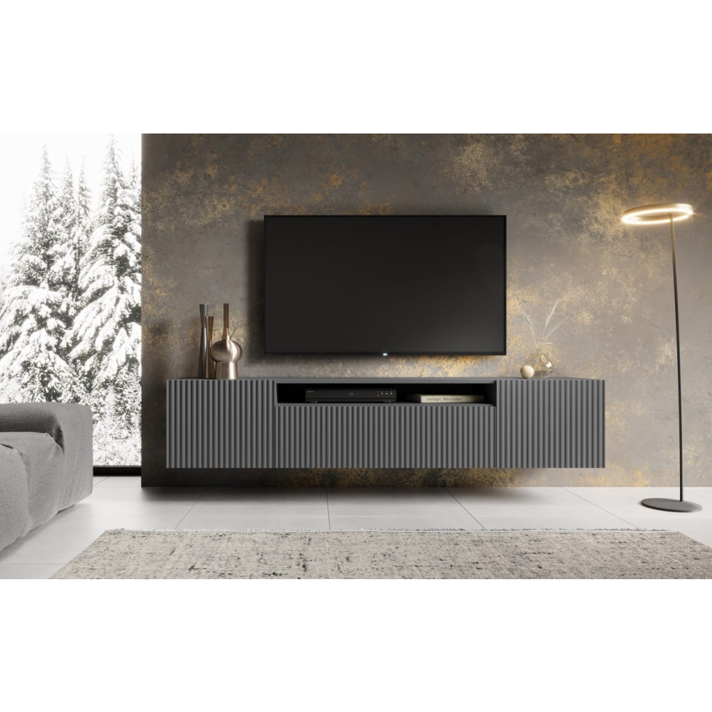Závesný TV stolík NOEMI je štýlový a praktický kus nábytku, ktorý dokonale doplní modernú obývačku. Elegantný dizajn s ryhovaným čelom pôsobí luxusne a zároveň nadčasovo. Premyslené vnútorné usporiadanie ponúka dostatok priestoru na televíznu techniku, príslušenstvo aj drobnosti. Stabilná konštrukcia a systém otvárania zabezpečujú pohodlné a tiché používanie každý deň. Tv stolík v luxusnom prevedení grafit má dĺžku 200 cm.