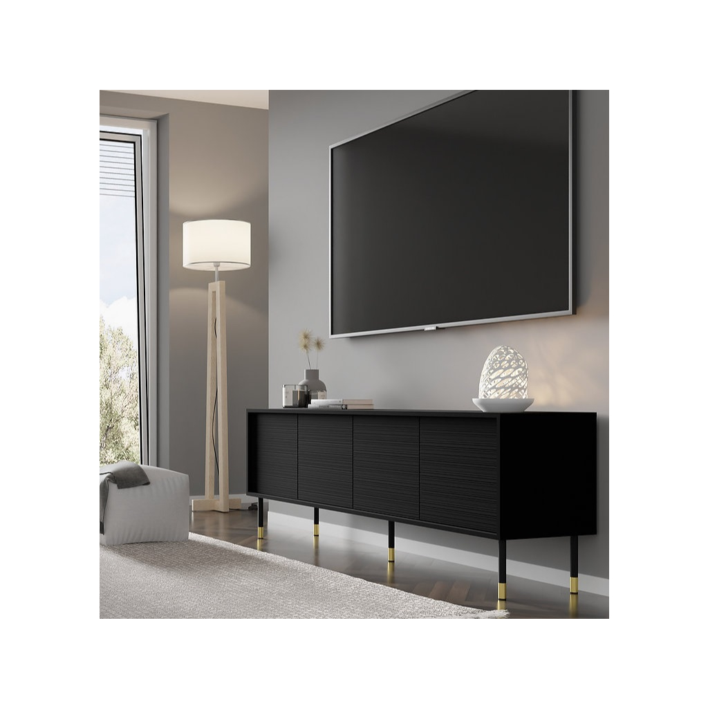 Tv stolík SHERWOOD obsahuje štýlový dizajn, ktorý krásne zapadne do modernej obývačky. Tento dizajn tv stolíka SHERWOOD je ideálny pre tých, ktorí chcú kombinovať klasickej krásy nábytku s modernými prvkami, ako sú čierne nohy a zlaté ozdoby. Najnovšie trendy tv stolíka SHERWOOD je vďaka unikátnym čelám s horizontálnymi frézovaním. Tv stolík má systém otvárania PUSH TO OPEN. Výška je uvedená s nohami 60 cm.