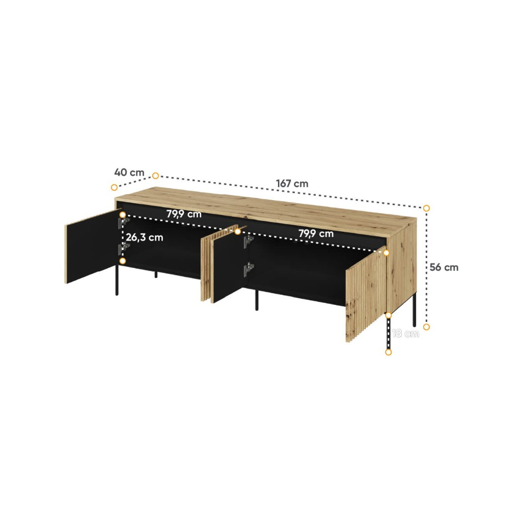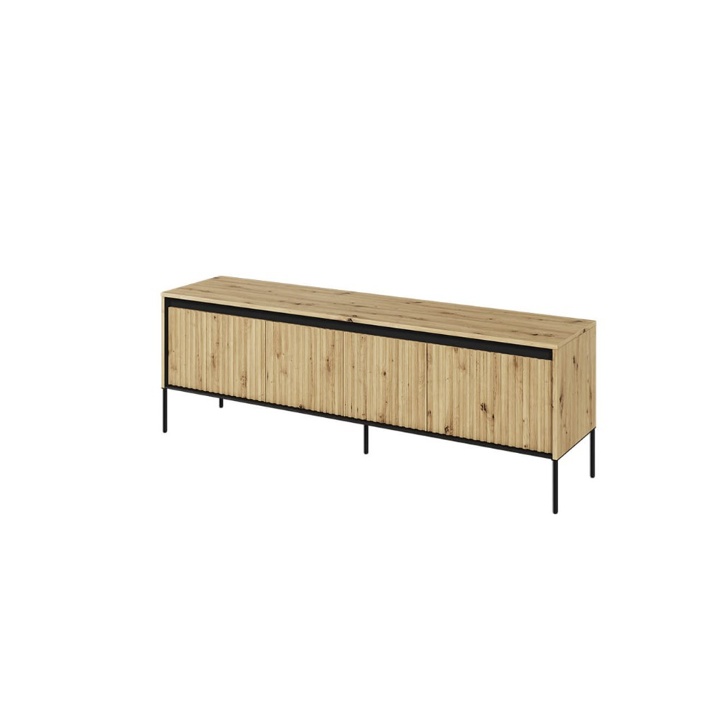 Štýlový TV stolík SWING TR-05 v modernom farebnom prevedení dub artisan je vyrobený z kvalitných materiálov. TV stolík má systém otvárania PUSH TO OPEN čo umožňuje jednoduché a pohodlné otváranie a zatváranie bez potreby použitia úchytiek. Lamelový dizajn dvierok je ďalším estetickým prvkov, ktorý pridáva osobitý šarm a štýl. Elegantné kovové nohy v čierne farbe pridávajú ľahkosť do celkového vzhľadu a zvyšujú stabilitu a odolnosť. V cene Tv stolíka je LED osvetlenie. TV stolík je dodávaný v demonte.