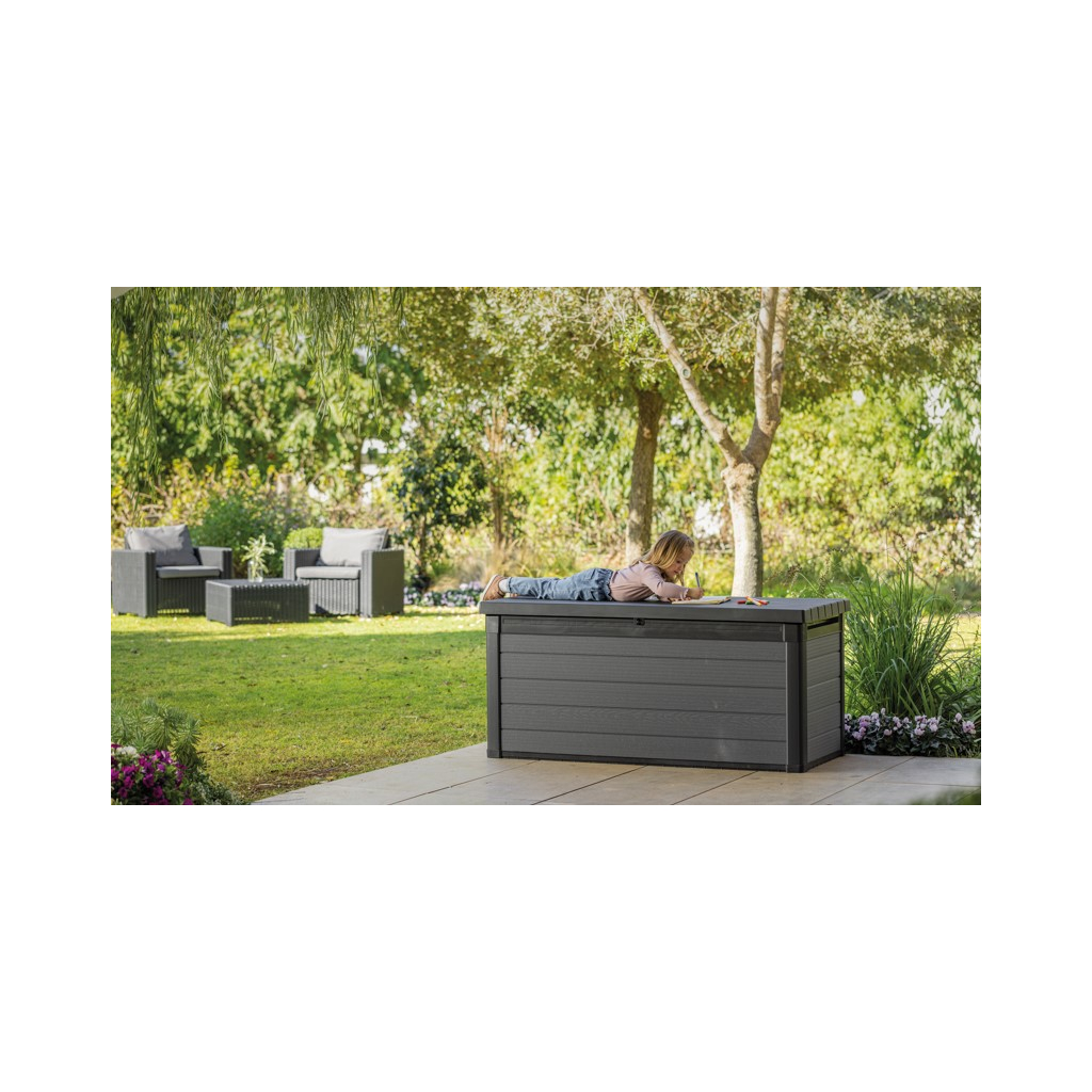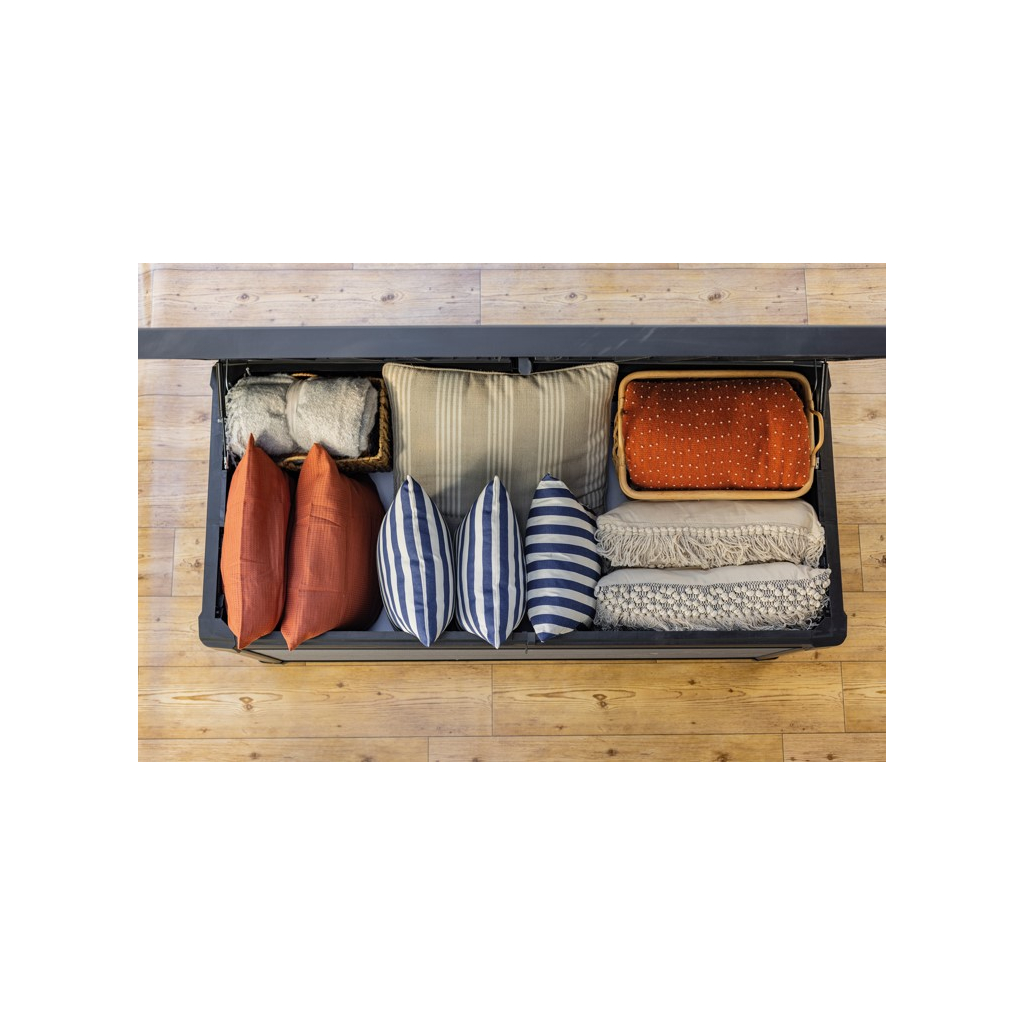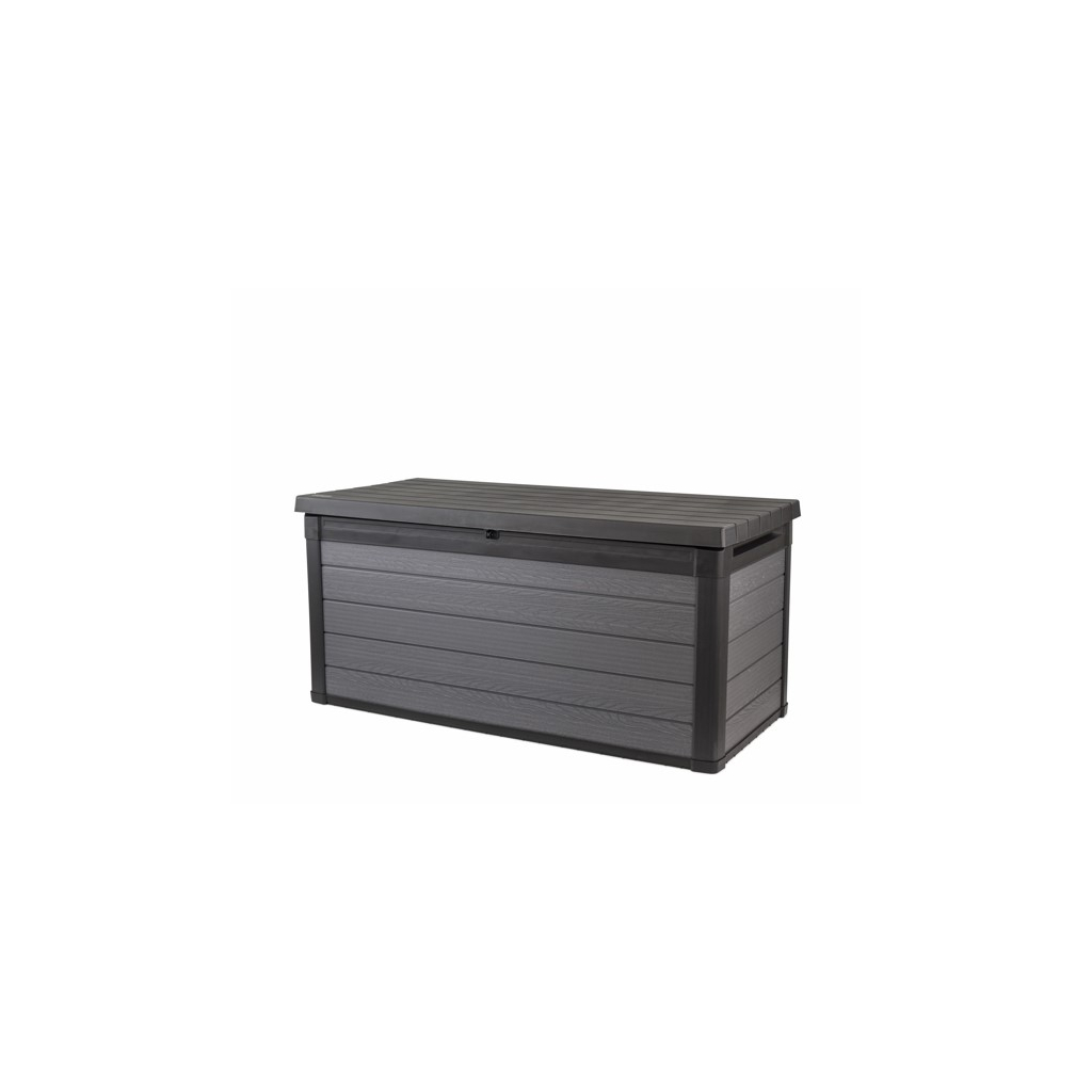 Plastový úložný box AMPEZZO v modernej sivej farbe predstavuje ideálne riešenie na uskladnenie záhradných a terasových potrieb. Jeho dizajn s imitáciou dreva elegantne zapadá do akéhokoľvek vonkajšieho prostredia. Pre pohodlnú manipuláciu boxu je vybavený bočnými rukoväťami, pričom uzamykateľné veko poskytuje zvýšenú bezpečnosť uložených vecí.