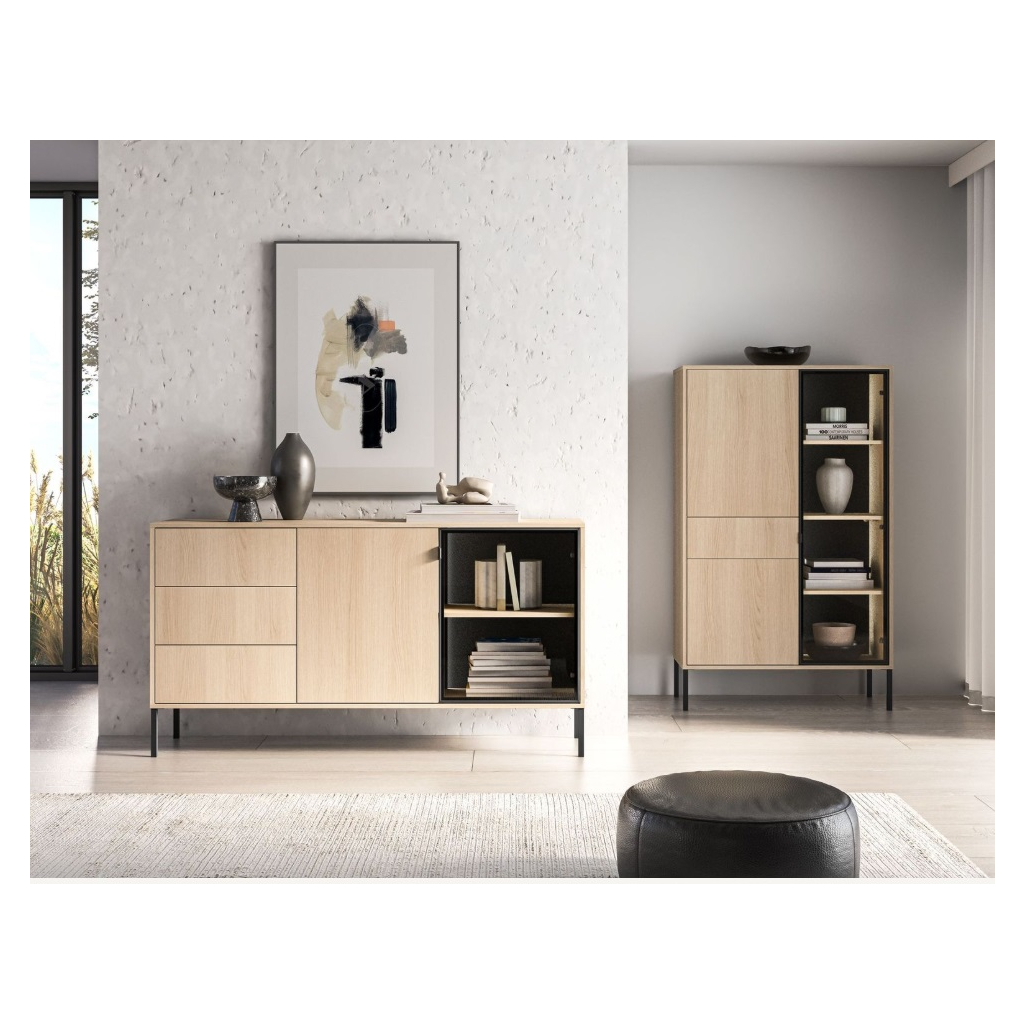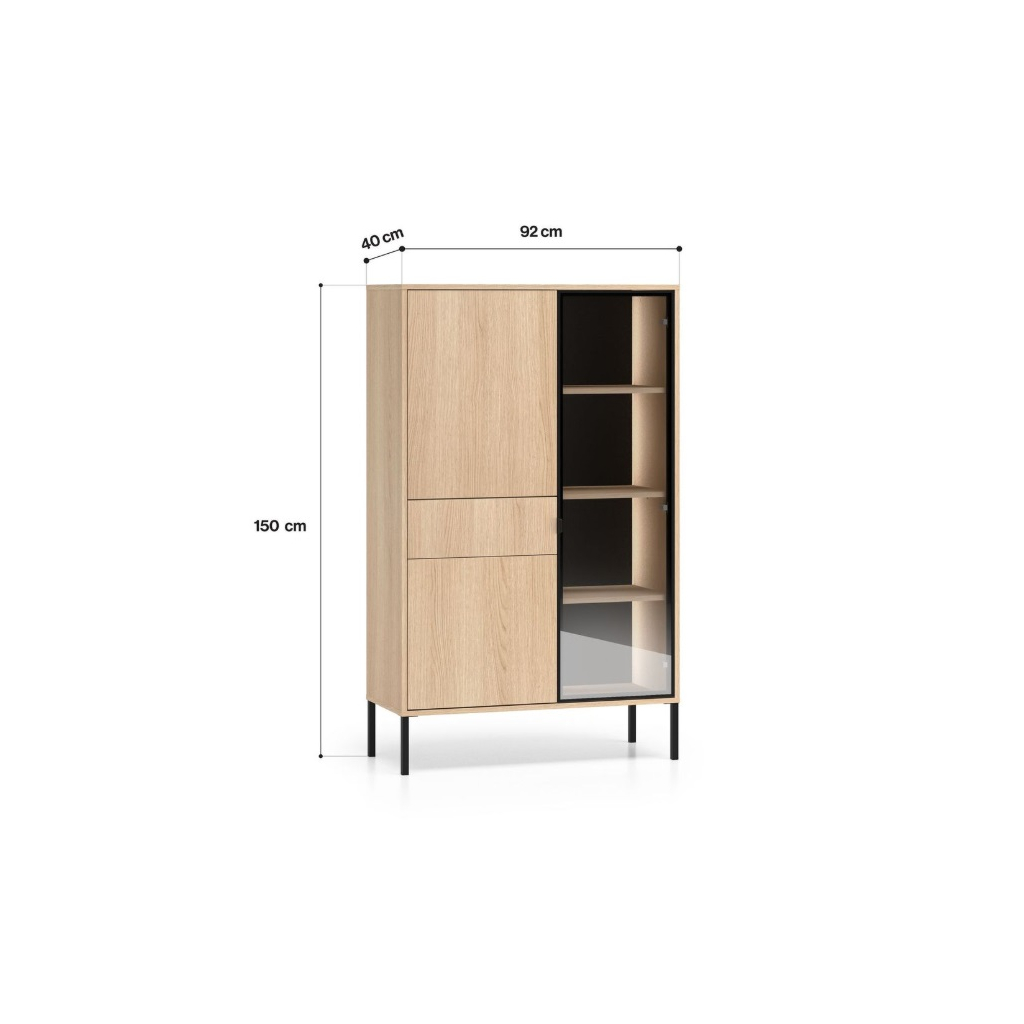 Vitrína ABEREN 01 vo farebnom prevedení dub lindberg prináša moderný nábytok s čistými líniami, elegantnými detailmi a praktickými riešeniami. Kombinácia hliníkového rámu v čiernej farbe s tvrdeným sklom, kovových prvkov a jemného LED podsvietenia vytvára sofistikovaný vzhľad, ktorý dodá obývačke či spálni jedinečnú atmosféru. Ideálna voľba pre tých, ktorí hľadajú štýl, funkčnosť a nadčasový dizajn v jednom. Vitrína je priestranná s vysokými nohami, ktoré sú vhodné pre robotický vysávač.