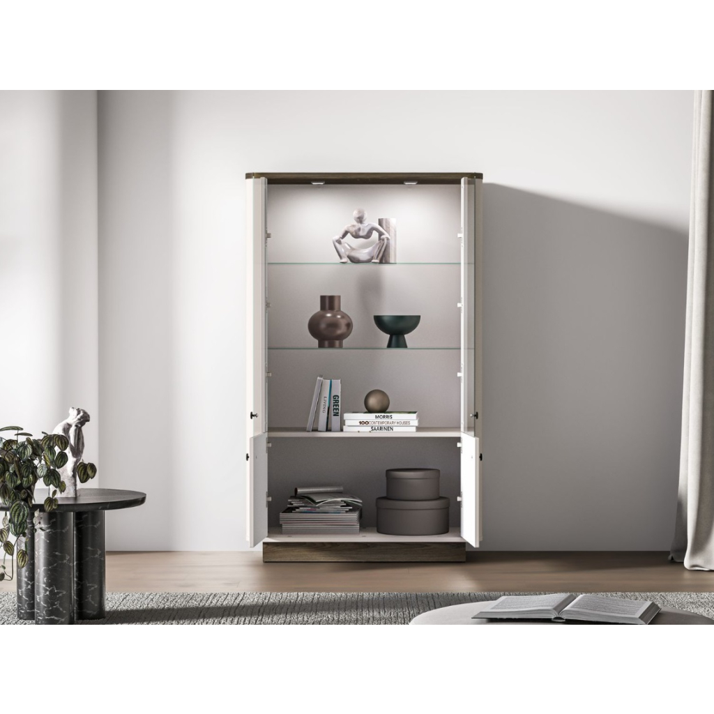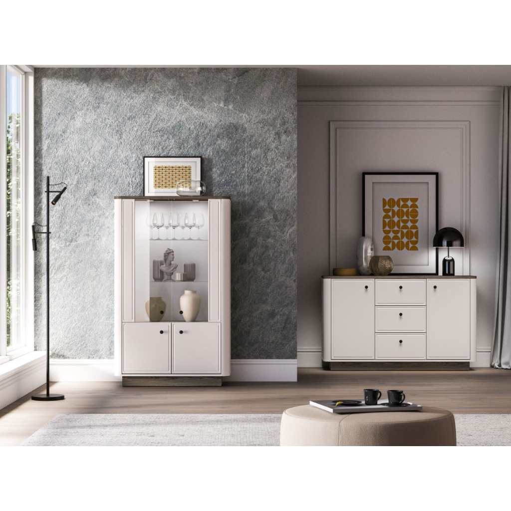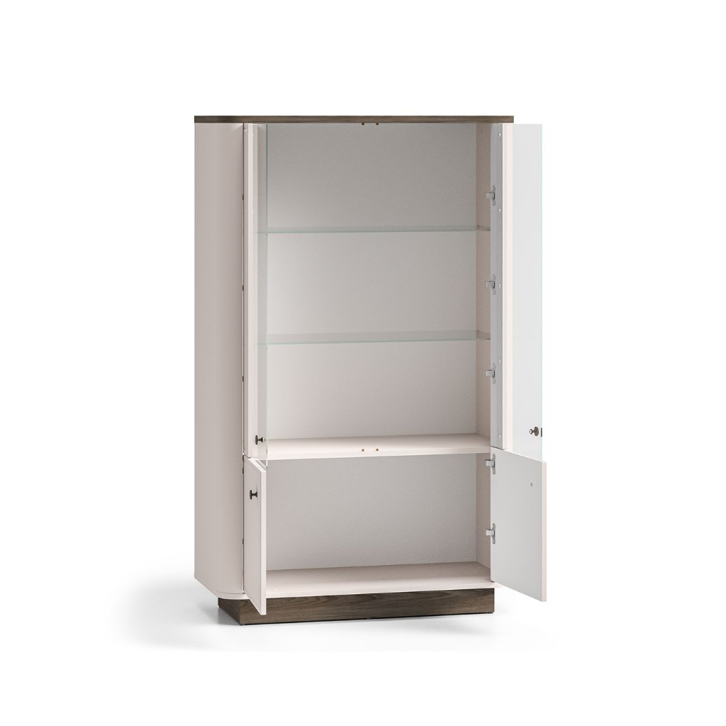 Objavte nábytok OLIVAVI, ktorý kombinuje eleganciu, štýl a funkčnosť. Táto kolekcia je ideálna do obývacích izieb, pričom jej dizajn okamžite zaujme jemne zaoblenými prechodmi medzi korpusom a čelami nábytku. Kontrastné kombinácie dekorov klasický kašmírový a tmavo tónovaný dub Windmill dodávajú nábytku moderný a luxusný vzhľad. Vkusné kovové úchytky pridávajú nábytku eleganciu a sofistikovanosť. S nábytkom získate do svojho interiéru noblesu, štýlovosť a vysokú kvalitu, ktorá pozdvihne každý priestor. Vitrína OLIVAVI 02 je štvordverová s časti presklenná, dodávaná v demonte.