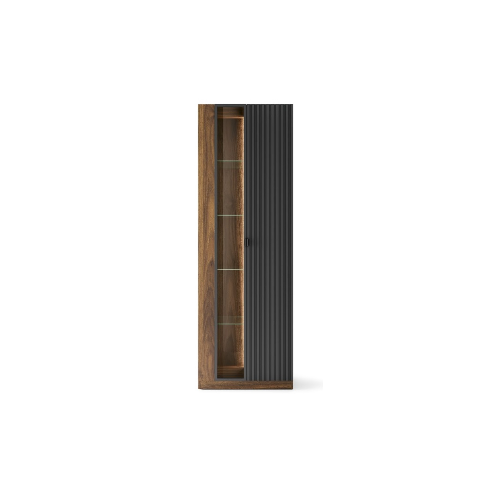 Vitrína RADIUM 11 predstavuje ideálne spojenie moderného dizajnu, funkčnosti a komfortu pre každodenné používanie. Elegantná kombinácia dekoru orech columbia a matnej čiernej farby vytvára nadčasový vzhľad, ktorý sa hodí do moderných aj minimalistických interiérov. Vitrína ponúka dostatok úložného priestoru na elektroniku, knihy, dekorácie aj bežné drobnosti. Integrované LED osvetlenie vytvára príjemnú atmosféru. Komfort používania zvyšuje soft-close systém, ktorý zabezpečuje tiché a plynulé zatváranie dvierok.
