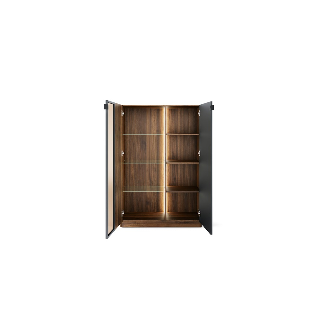Vitrína RADIUM 15 predstavuje ideálne spojenie moderného dizajnu, funkčnosti a komfortu pre každodenné používanie. Elegantná kombinácia dekoru orech columbia a matnej čiernej farby vytvára nadčasový vzhľad, ktorý sa hodí do moderných aj minimalistických interiérov. Vitrína ponúka dostatok úložného priestoru na elektroniku, knihy, dekorácie aj bežné drobnosti. Integrované LED osvetlenie vytvára príjemnú atmosféru. Komfort používania zvyšuje soft-close systém, ktorý zabezpečuje tiché a plynulé zatváranie dvierok.