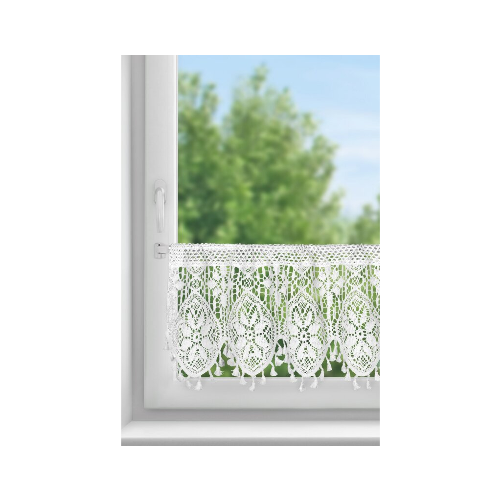 Krátka záclona s ažurovým kvetinovým vzorom Šírka: 150 cm, Dĺžka: 30 cm, Farba: biela, Hmotnosť: 230 GSM, Zloženie: Materiál: 60 % bavlna, 40 % polyester