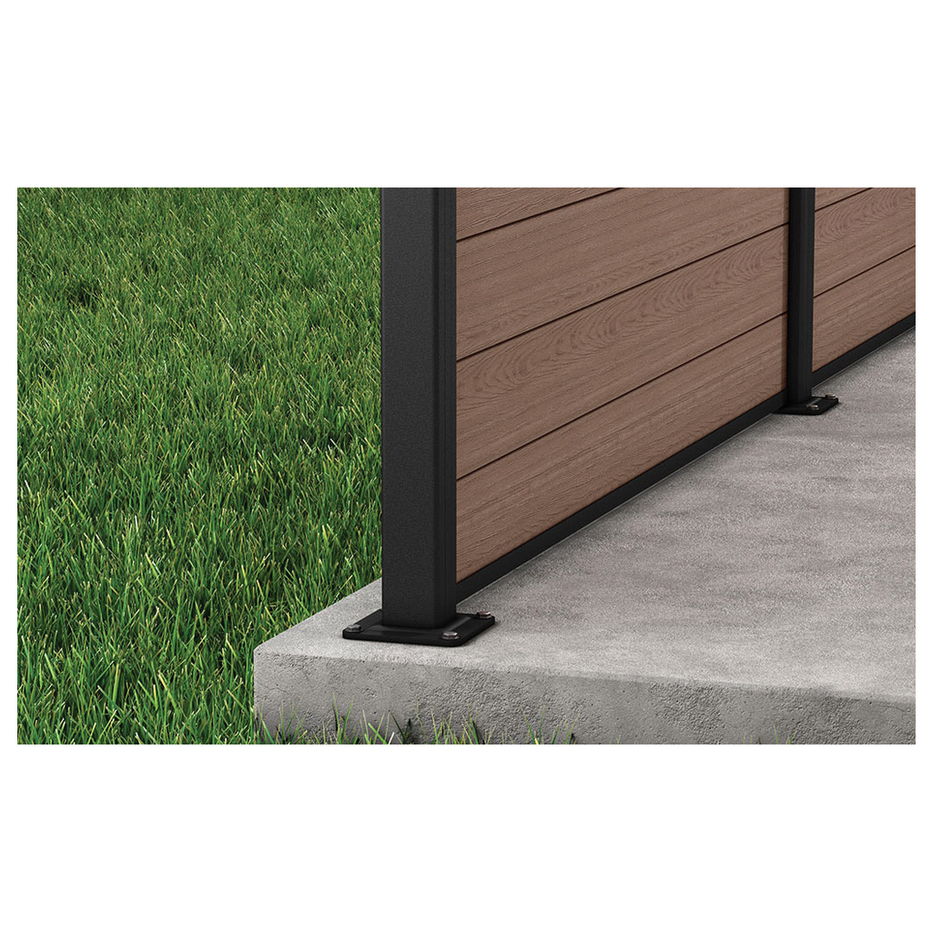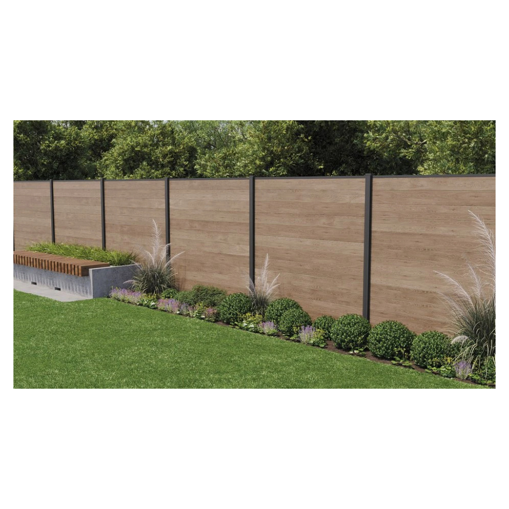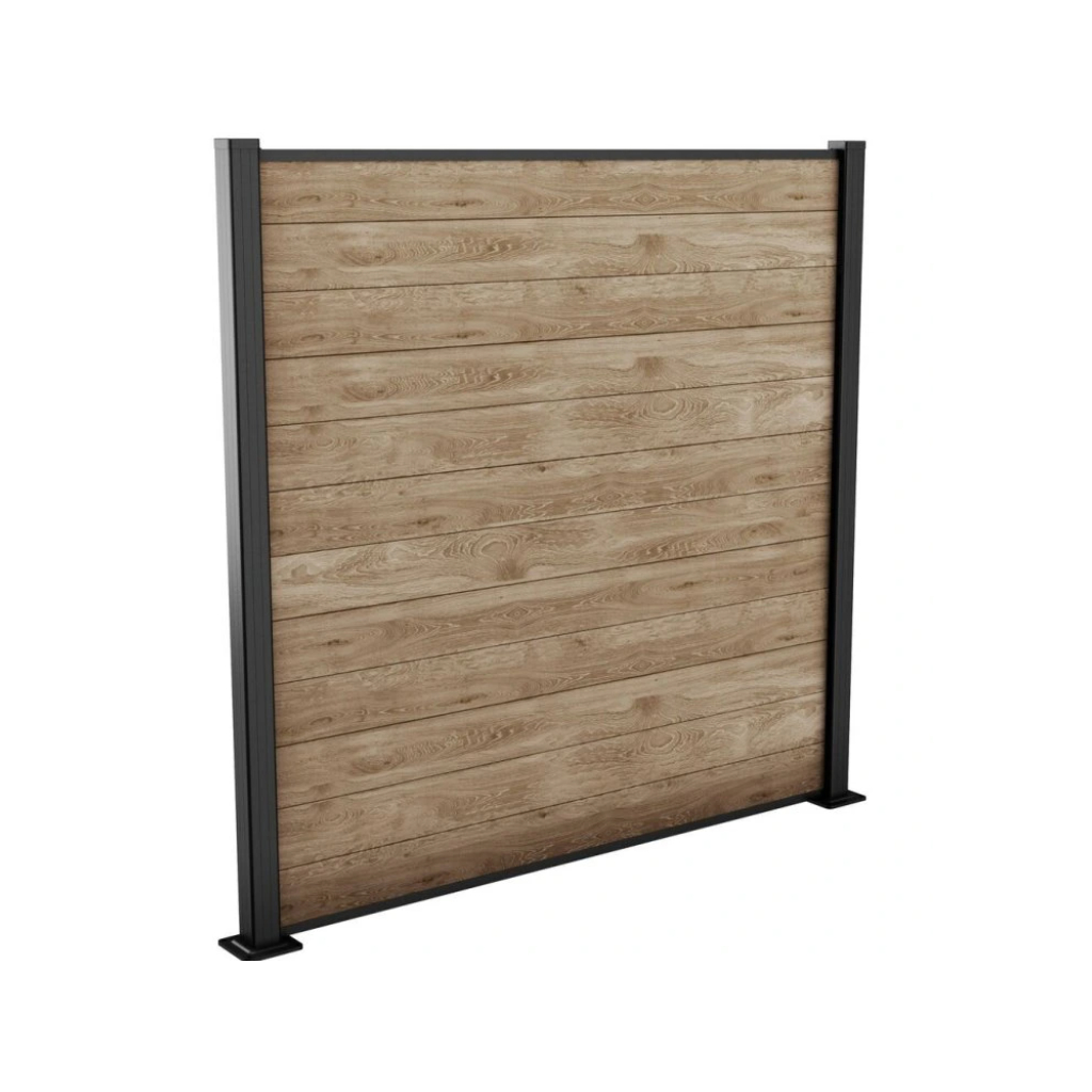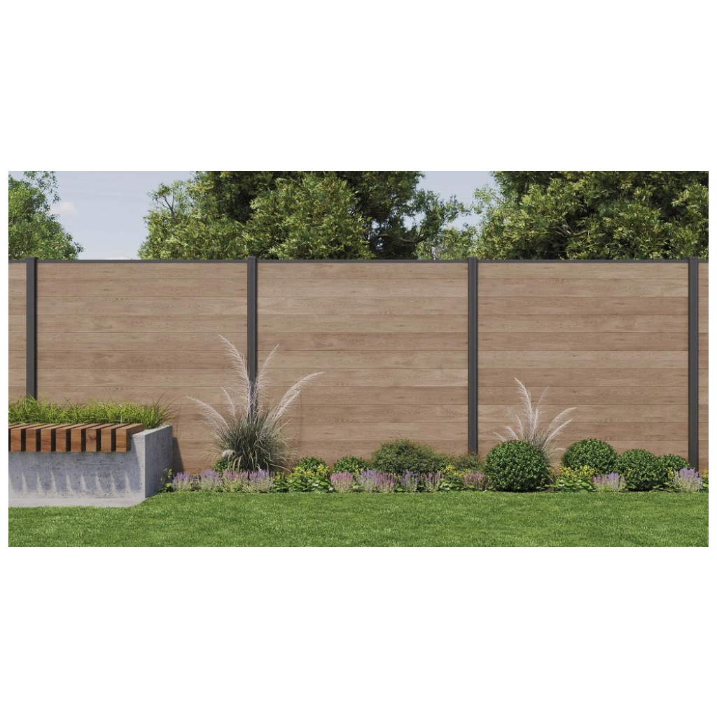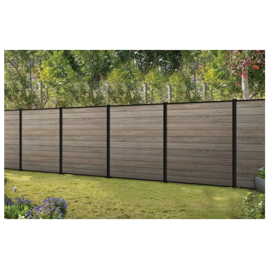 Plotový panel je vyrobený z patentovaného kompozitného plastu, ktorý kombinuje teplý vzhľad dreva v tmavohnedom farebnom prevedení ashwood (jaseňové drevo) s bezúdržbovými vlastnosťami živice. Vďaka robustnej konštrukcii (dvojstenné panely s hrúbkou 21 mm a oceľovou výstužou) odolá vetru s rýchlosťou až 95 km/h.