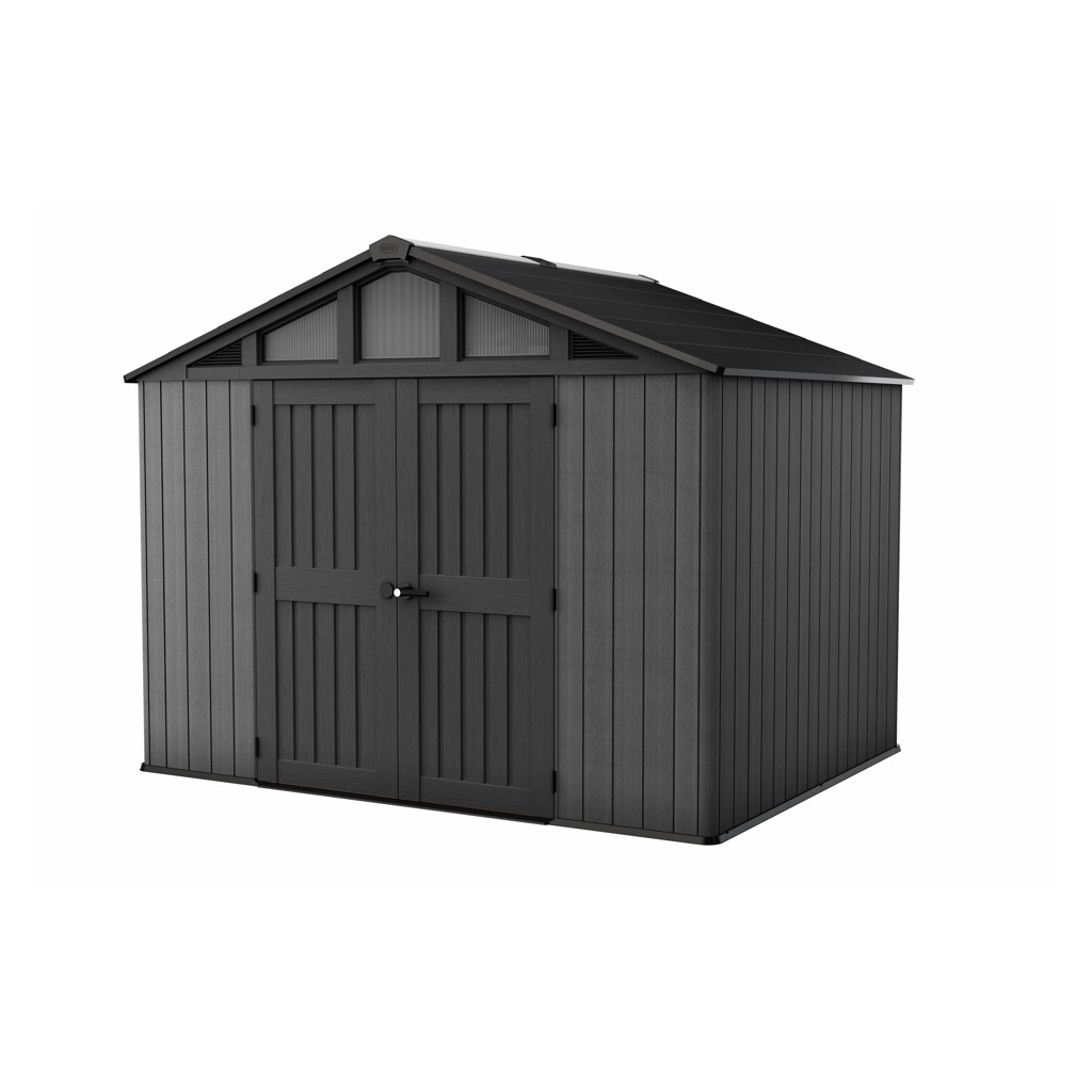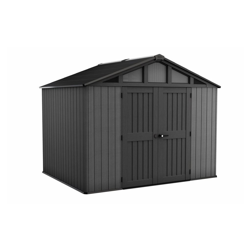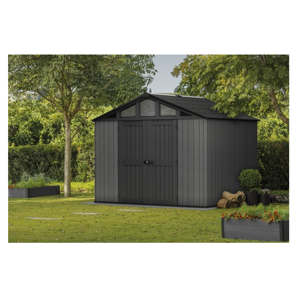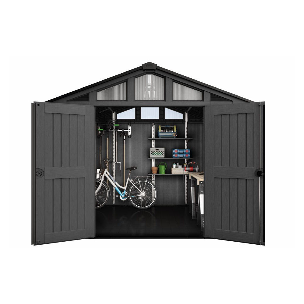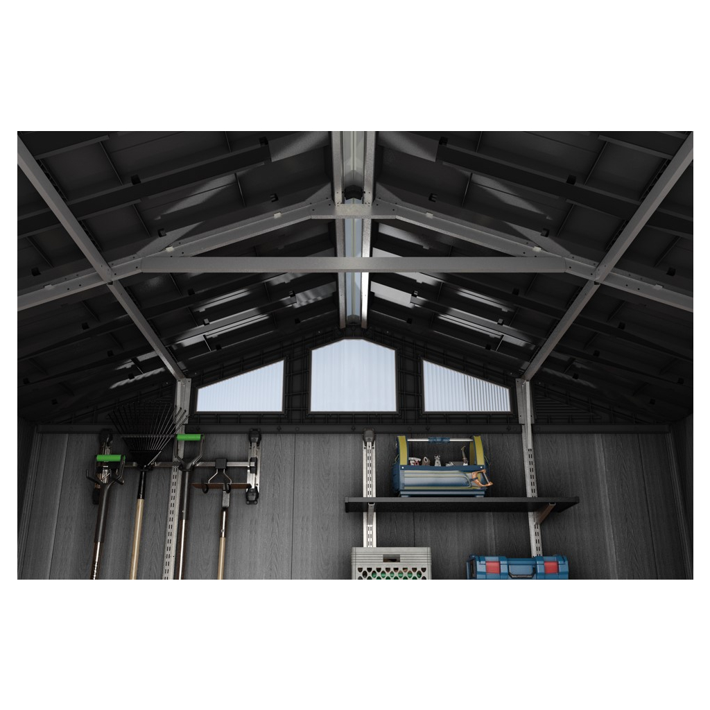 Bezúdržbový záhradný domček GARRISON v rozmere 10 x 8 m ponúka praktické riešenie na skladovanie záhradného náradia, kosačky, bicyklov alebo grilovacieho náradia. Domček je vybavený širokými dvojitými dverami pre jednoduchý prístup, vysokým a pevným stropom a vysoko odolnou podlahou. Pevná strecha a oceľová výstuž zabezpečujú dlhú životnosť, zatiaľ čo možnosť zamykania 3-bodovým uzamykacím systémom poskytuje vyššiu úroveň bezpečnosti (visiaci zámok nie je v cene ). Vďaka modernému dizajnu je tento domček ideálnym doplnkom každej záhrady. Police nie sú súčasťou záhradného domčeka, ale môžete si ich doobjednať - Police do záhradného domčeka SHELVING KIT 100 .