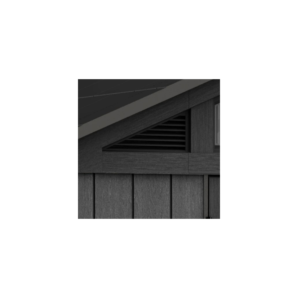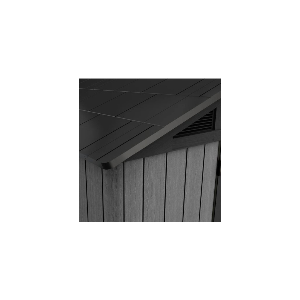 Záhradný domček má elegantný dizajn so štruktúrou povrchu pripomínajúcu drevo, je vyrobený z kvalitného kompozitného materiálu EVOTECH, ktorý je pevnejší ako samotné drevo a nevyžaduje žiadnu údržbu, je odolný voči rôznym druhom poškodenia. Odolné podlahové panely, kvalitné odvetranie pod strechou a svetlíky pre dostatok prirodzeného svetla podporia perfektný dojem zo záhradného domčeka.