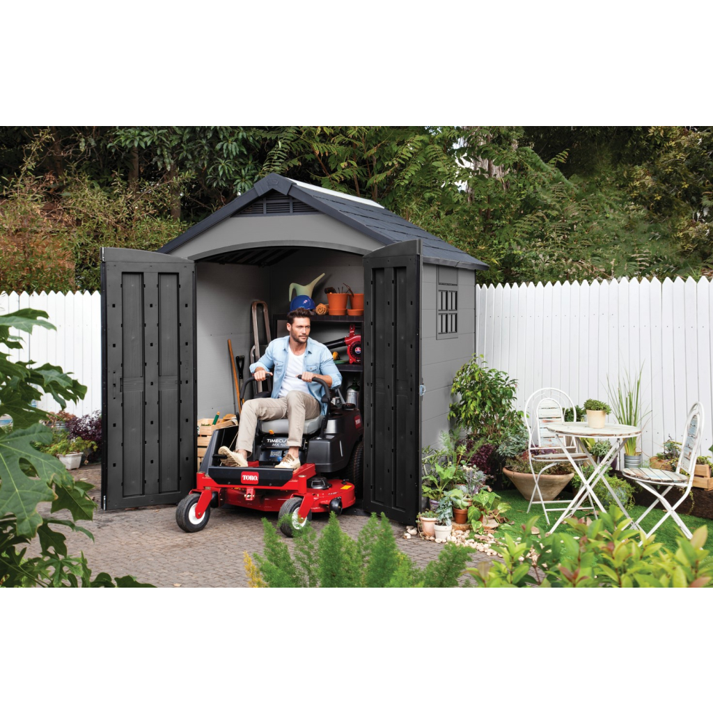 Bezúdržbový záhradný domček PRESIDENT 757 je ideálny nielen na uschovávanie náradia a záhradných doplnkov, ale aj na kosačku alebo grill. Zámok nie je súčasťou. Domček v modernom prevedení je ideálny ma každú záhradu. Police nie sú súčasťou záhradného domčeka, ale môžete si ich doobjednať - Police do záhradného domčeka SHELVING KIT 100 .