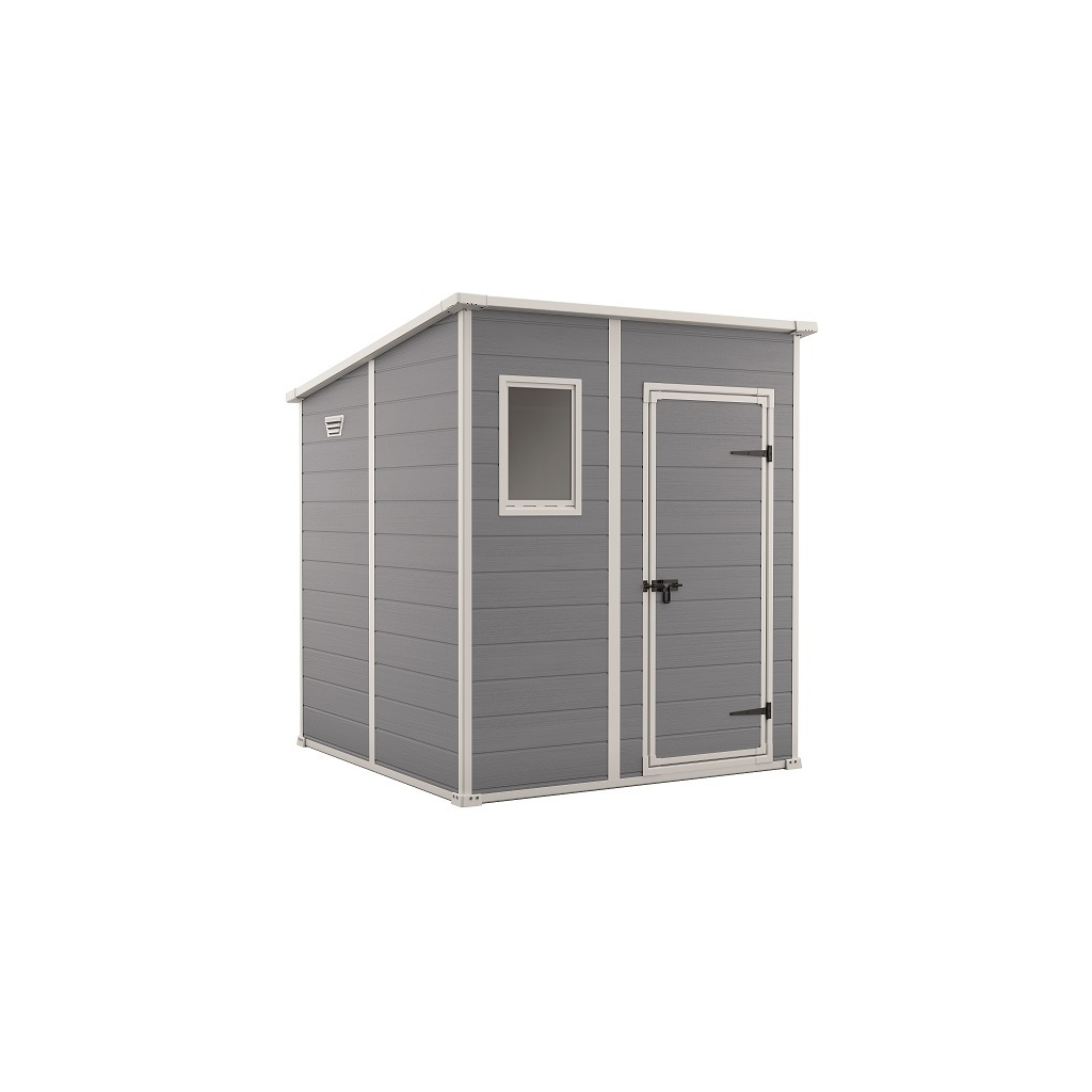Jednoduchý bezúdržbový záhradný domček RAMON PENT 6x6 sa skvele hodí na každú záhradu, kde je potrebné uskladnenie náradia a príslušenstva. Vstavaný ventilačný panel zaisťuje stály prívod vzduchu do interiéru a súčasne chráni pred škodlivými účinkami vlhkosti. Domček sa vyznačuje kvalitou, dizajnom a extrémnou stabilitou. Police nie sú súčasťou záhradného domčeka, ale môžete si ich doobjednať - Police do záhradného domčeka SHELVING KIT 100 .