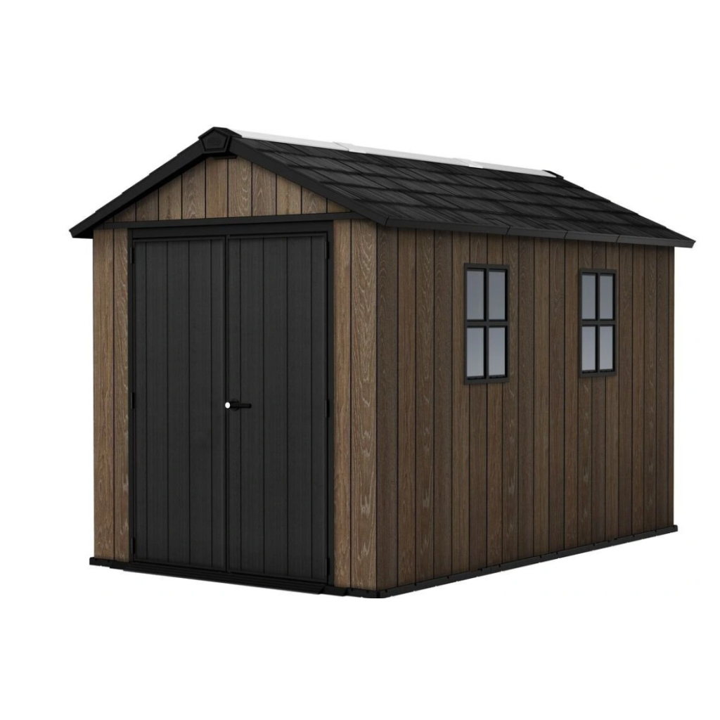 Bezúdržbový záhradný domček WALNUT 11 x 7,5 / orech, ponúka skvelé riešenie na skladovanie náradia, kosačky, bicyklov alebo grilovacieho náradia. Domček je vybavený širokými dvojitými dverami pre jednoduchý prístup, vysokým a pevným stropom a vysoko odolnou podlahou. Pevná strecha a oceľová výstuž zabezpečujú dlhú životnosť, zatiaľ čo možnosť uzamykania 3-bodovým uzamykacím systémom poskytuje vyššiu úroveň bezpečnosti (visiaci zámok nie je v cene ). Vďaka praktickému dizajnu je tento domček ideálnym doplnkom každej záhrady. Police nie sú súčasťou záhradného domčeka, ale môžete si ich doobjednať - Police do záhradného domčeka SHELVING KIT 100 .