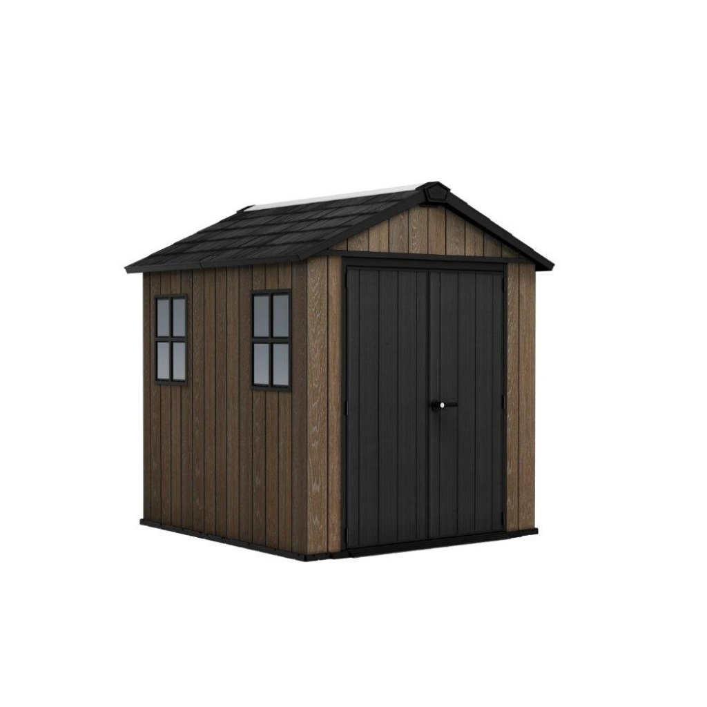 Bezúdržbový záhradný domček WALNUT 7X7,5 / orech, ponúka praktické riešenie na skladovanie záhradného náradia, kosačky, bicyklov alebo grilovacieho náradia. Domček je vybavený širokými dvojitými dverami pre jednoduchý prístup, vysokým a pevným stropom a vysoko odolnou podlahou. Pevná strecha a oceľová výstuž zabezpečujú dlhú životnosť, zatiaľ čo možnosť zamykania 3-bodovým uzamykacím systémom poskytuje vyššiu úroveň bezpečnosti (visiaci zámok nie je v cene ). Vďaka modernému dizajnu je tento domček ideálnym doplnkom každej záhrady. Police nie sú súčasťou záhradného domčeka, ale môžete si ich doobjednať - Police do záhradného domčeka SHELVING KIT 100 .