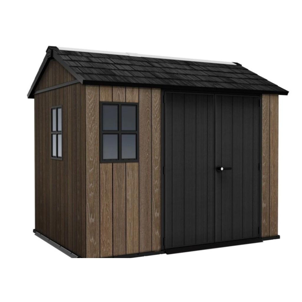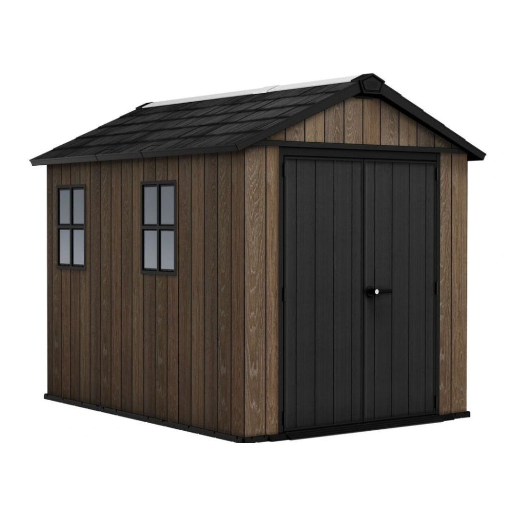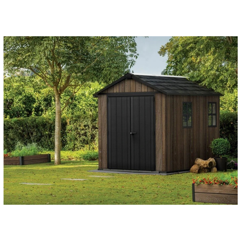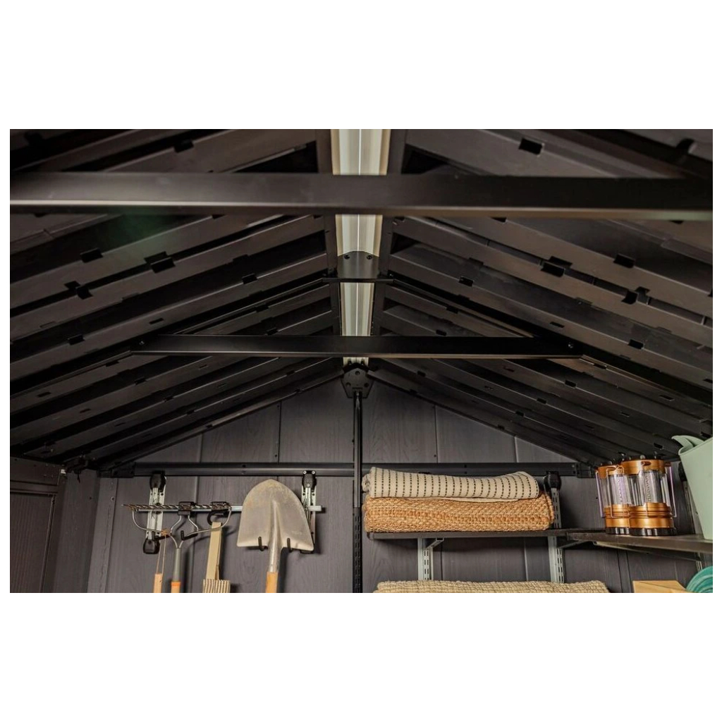 Bezúdržbový záhradný domček WALNUT 9x7,5 / jaseň, ponúka praktické riešenie na skladovanie náradia, kosačky, bicyklov alebo grilovacieho náradia. Domček je vybavený širokými dvojitými dverami pre jednoduchý prístup, vysokým a pevným stropom a vysoko odolnou podlahou. Pevná strecha a oceľová výstuž zabezpečujú dlhú životnosť, zatiaľ čo možnosť uzamykania 3-bodovým uzamykacím systémom poskytuje vyššiu úroveň bezpečnosti (visiaci zámok nie je v cene ). Vďaka modernému dizajnu je tento domček ideálnym doplnkom každej záhrady. Police nie sú súčasťou záhradného domčeka, ale môžete si ich doobjednať - Police do záhradného domčeka SHELVING KIT 100 .