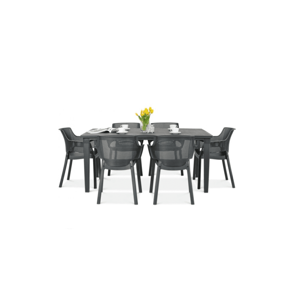 Exkluzívny záhradný plastový set CALLIE v prevedení grafit prinesie do vášho exteriéru štýlový a pohodlný dotyk. Záhradný set obsahuje kvalitný plastový stôl spolu so šiestimi elegantnými stoličkami. Záhradný plastový set CALLIE vo farbe grafit je ideálny pre rôzne príležitosti, vrátane rodinných osláv, grilovačiek alebo jednoducho na relaxačné popoludnia na slnku. Investujte do kvalitného a štýlového záhradného plastového setu a vytvorte si útulný a moderný kútik priamo vo vašej záhrade.