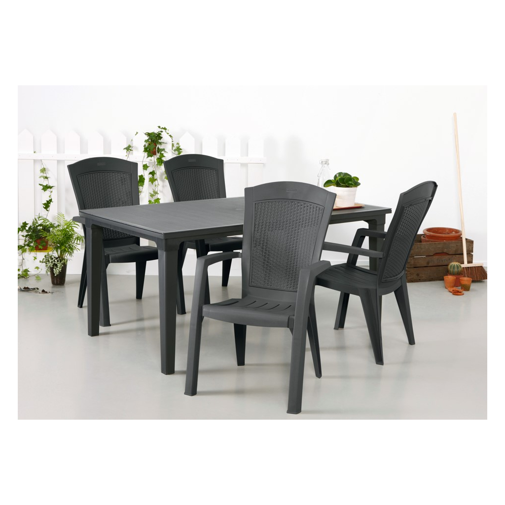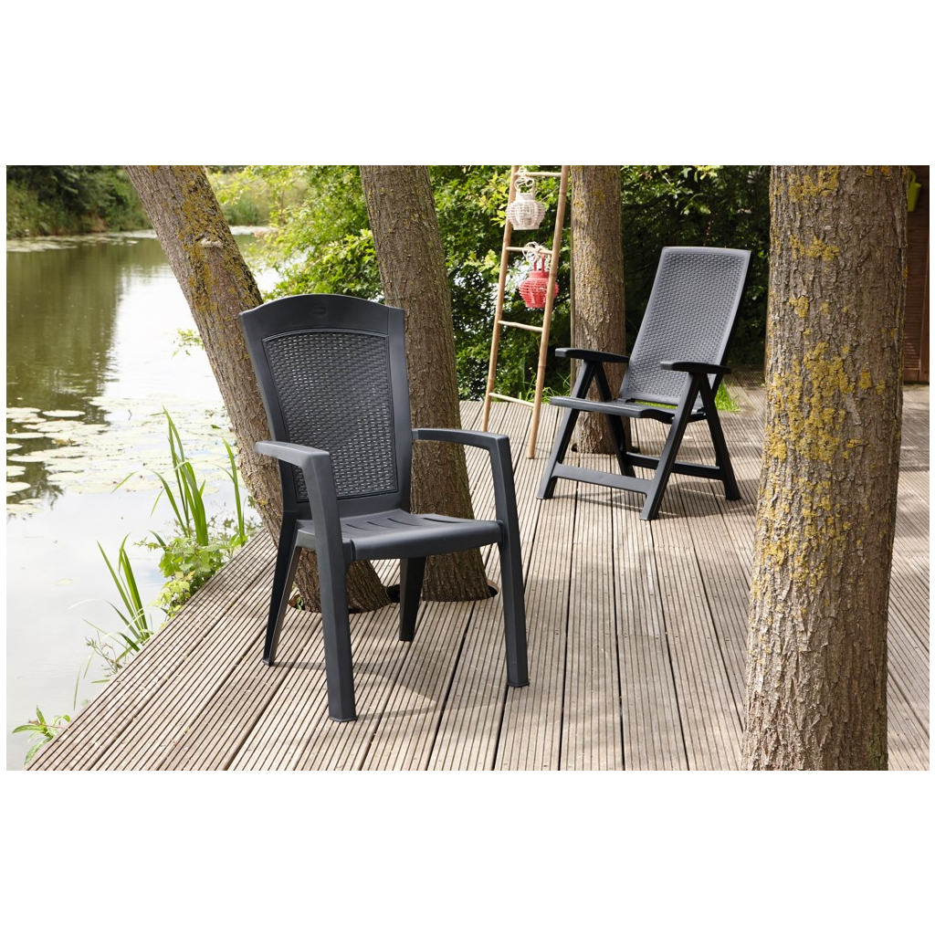 Moderná záhradná stolička METASSA vo farbe grafit má pohodlné sedenie s vysokou opierkou. Záhradná stolička je stohovateľná pre jednoduchšie uskladnenie. Záhradná stolička je vyrobená z kvalitného materiálu, ktorý sa jednoducho čistí. Kúpte si stoličku a vychutnajte si komfortné sedenie na záhrade.